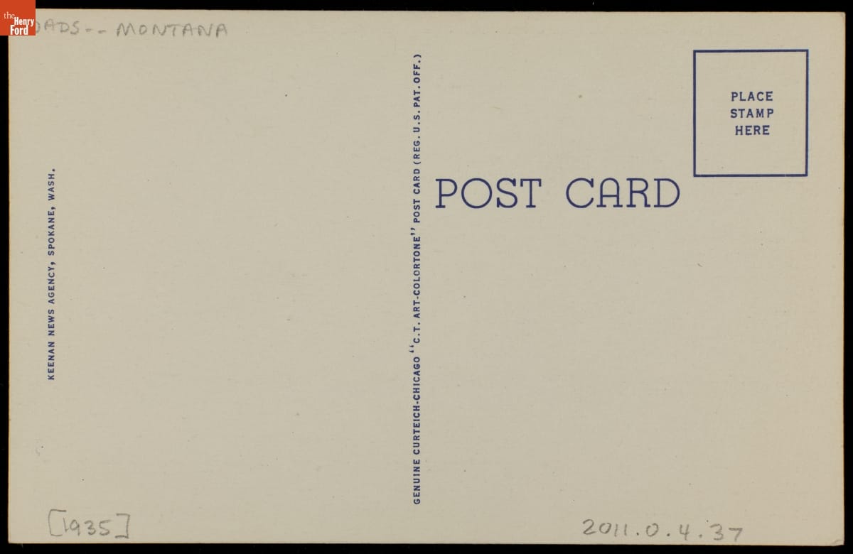 This postcard shows the Going-to-the-Sun Highway. The over fifty mile long route traverses the center of Glacier National Park in Montana. Work began in 1921 and was completed in 1932. Previous to completion, tourists arrived by train and viewed the park from horseback. Today, the roadway allows motorists access to the nation's tenth National Park.