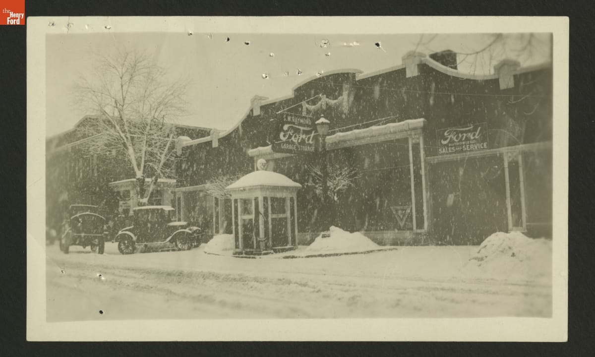 This 1920s photograph shows Samuel Raymond's gasoline station on Main Street in Adrian, Michigan. Drivers stopped along the curb to use this street side station. Gas, oil, and water were available. At times, cars lined the street waiting for service. The station was moved to The Henry Ford in 1930 when the street was widened.