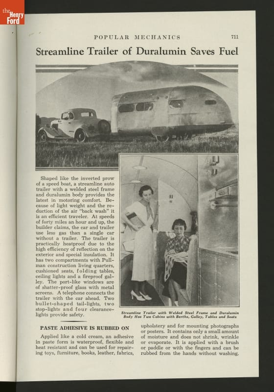 Popular Mechanics, first published in 1902, has made information about technology and science understandable to the general public. An article in this November 1935 issue highlighted a streamlined trailer with its duralumin body.