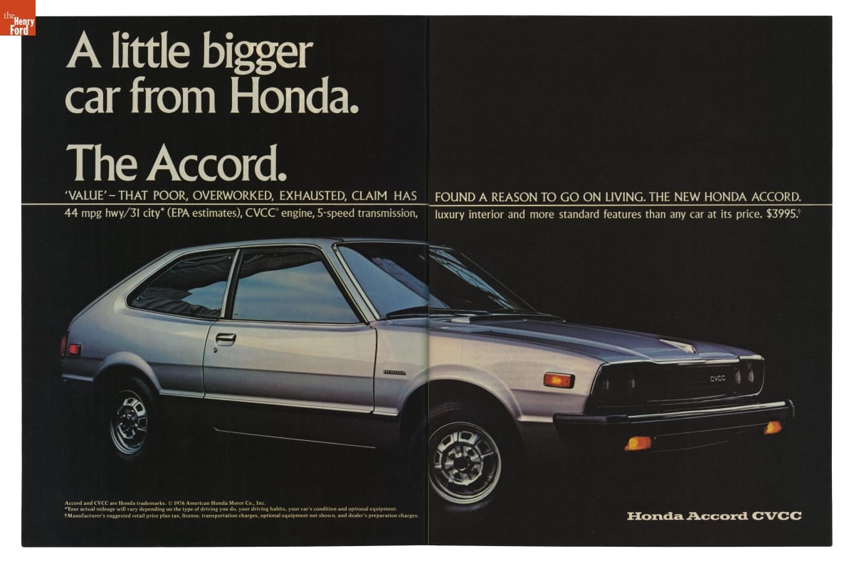 Car magazines in the United States examine the automobile industry, the vehicles and the people who drive them, and American car culture. Manufacturers also advertise their products in these pages. Honda promoted its Accord in this 1976 issue of Car and Driver. In 1989, the Accord became the first Japanese-badged car to top the annual sales charts in the U.S.