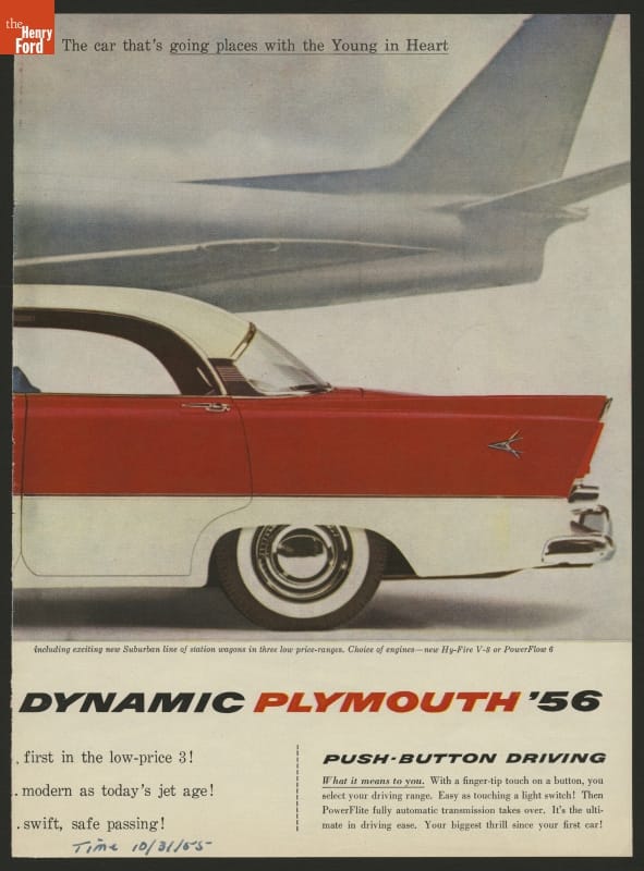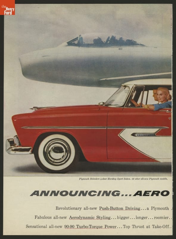 In case customers might have missed it, this ad from the 1950s shows how designers of the 1956 Plymouth took visual styling cues from jet aircraft.