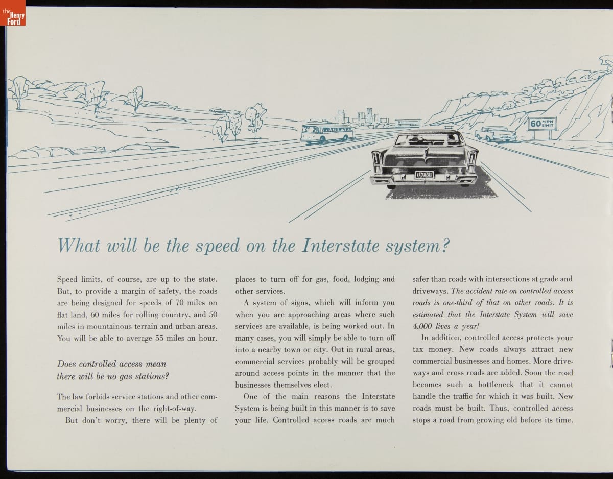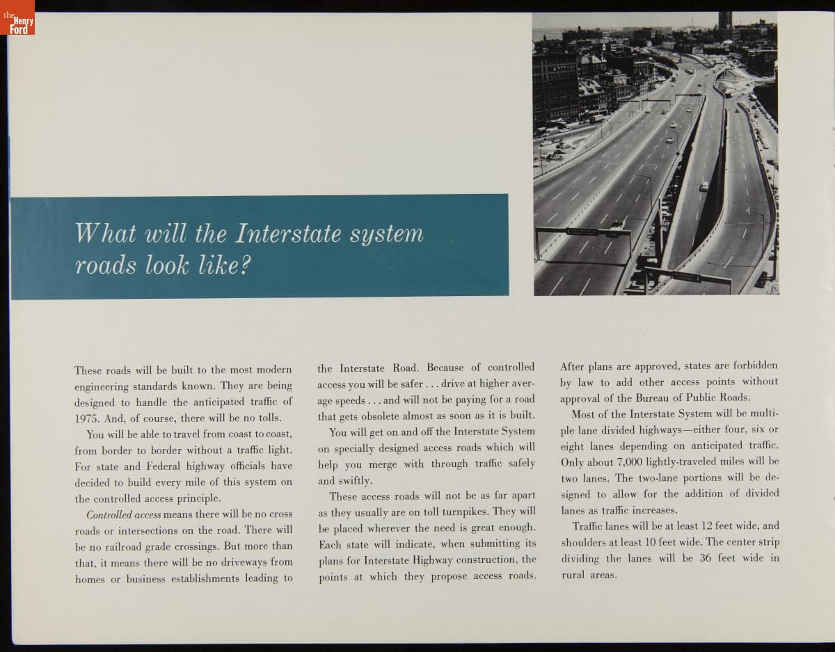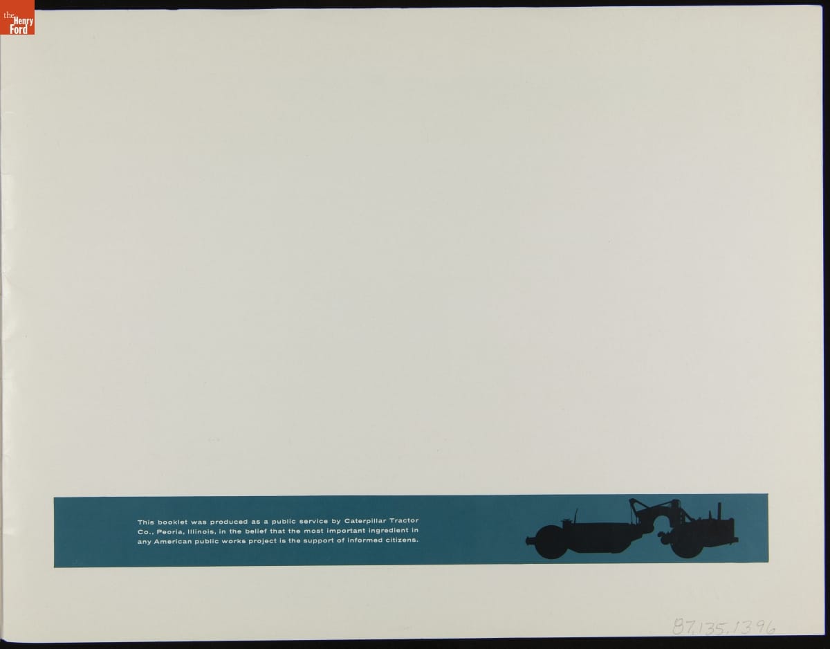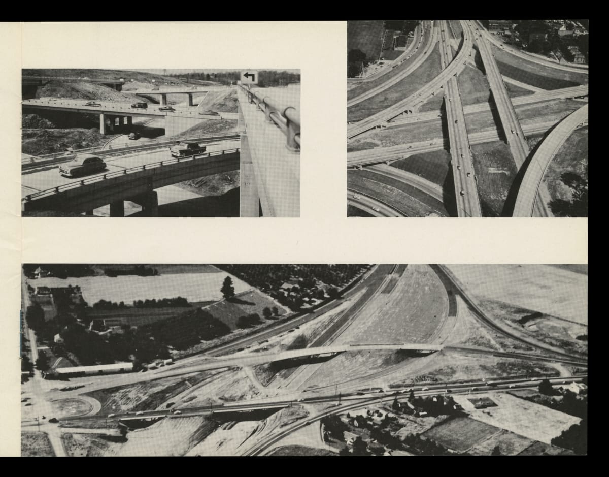 This 1956 publication, produced by Caterpillar Tractor Company, promoted the proposed Interstate Highway System. Photographs show well laid out interchanges and uncongested highways. A central map displays the 41,000 miles of expressways intended for completion by 1971. Authorized through the Federal-Aid Highway Act of 1956, the project's scope grew and it wasn't finished until 1992.