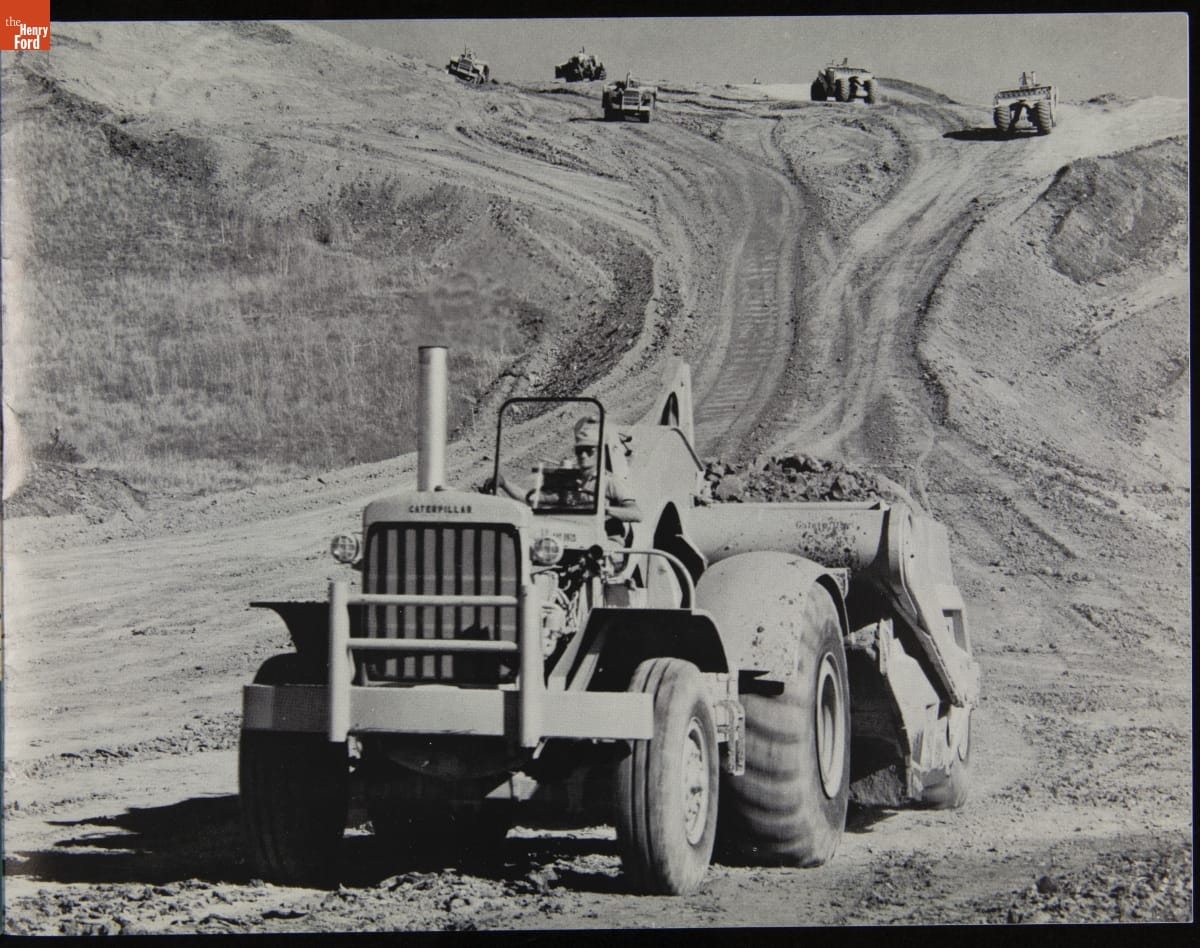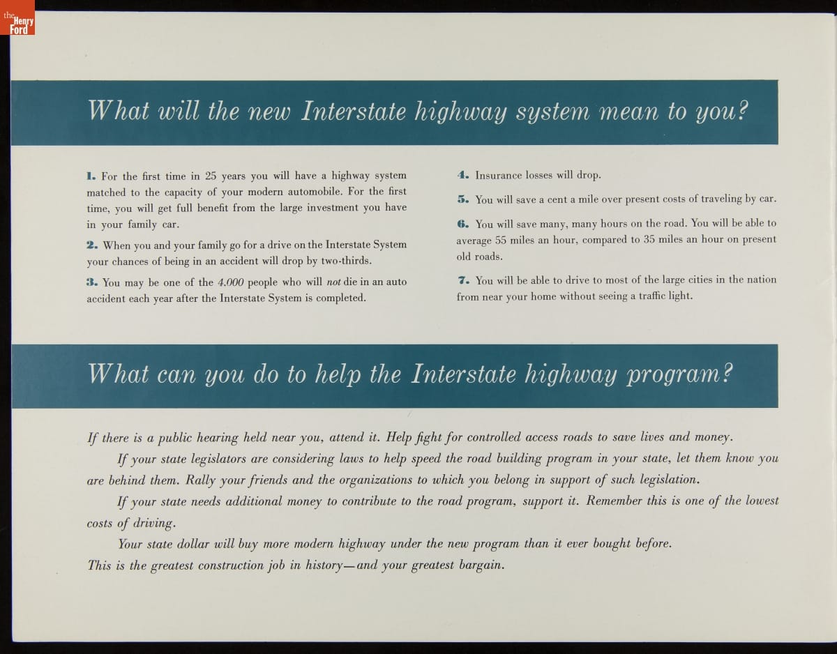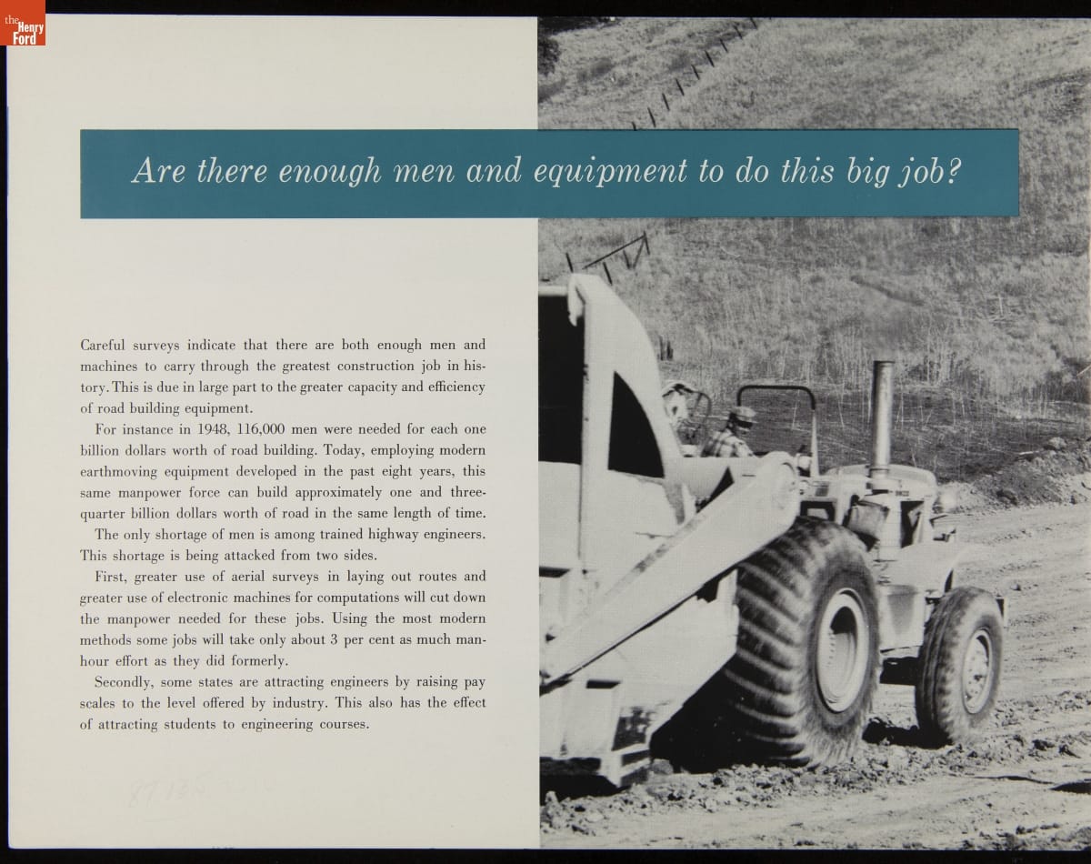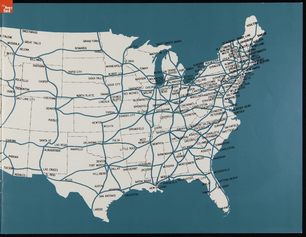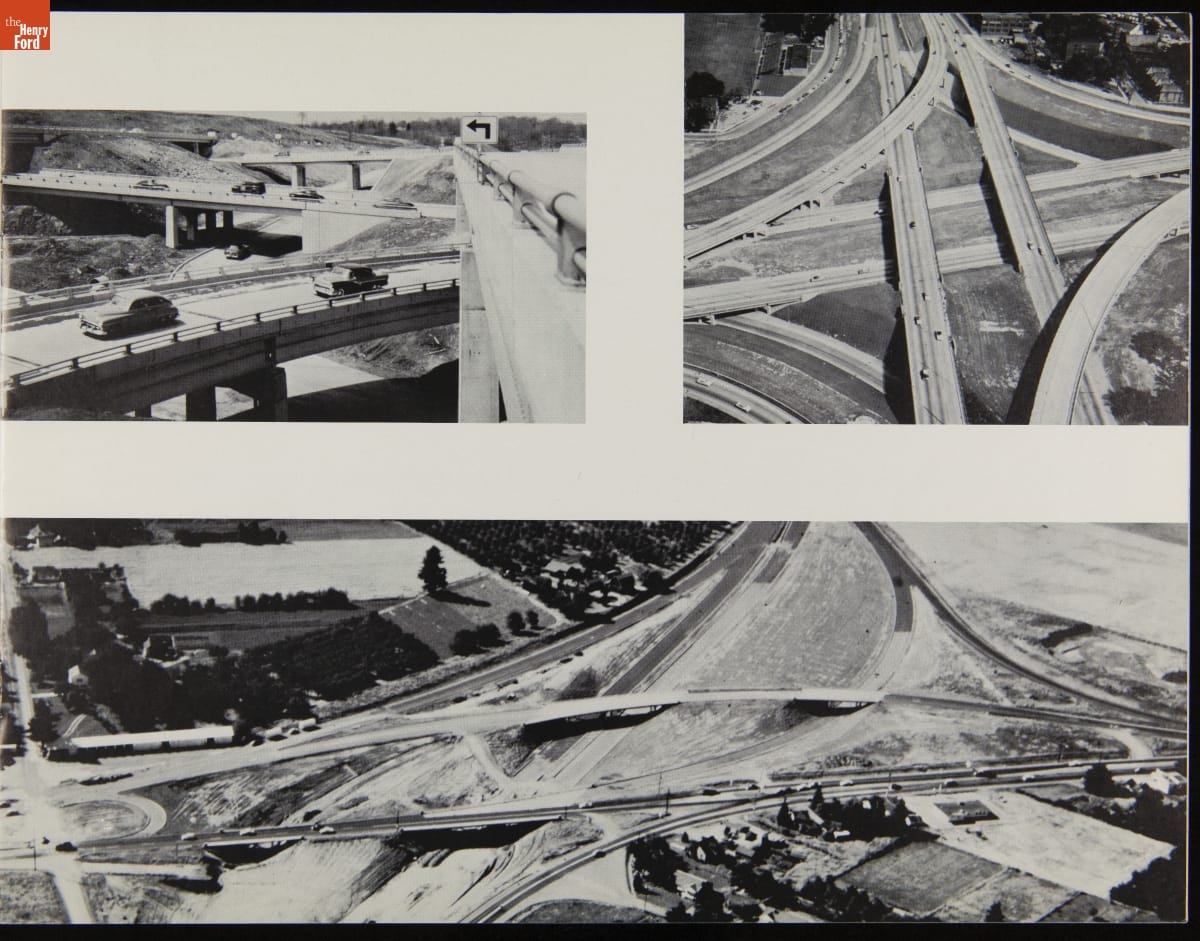 This 1956 publication, produced by Caterpillar Tractor Company, promoted the proposed Interstate Highway System. Photographs show well laid out interchanges and uncongested highways. A central map displays the 41,000 miles of expressways intended for completion by 1971. Authorized through the Federal-Aid Highway Act of 1956, the project's scope grew and it wasn't finished until 1992.