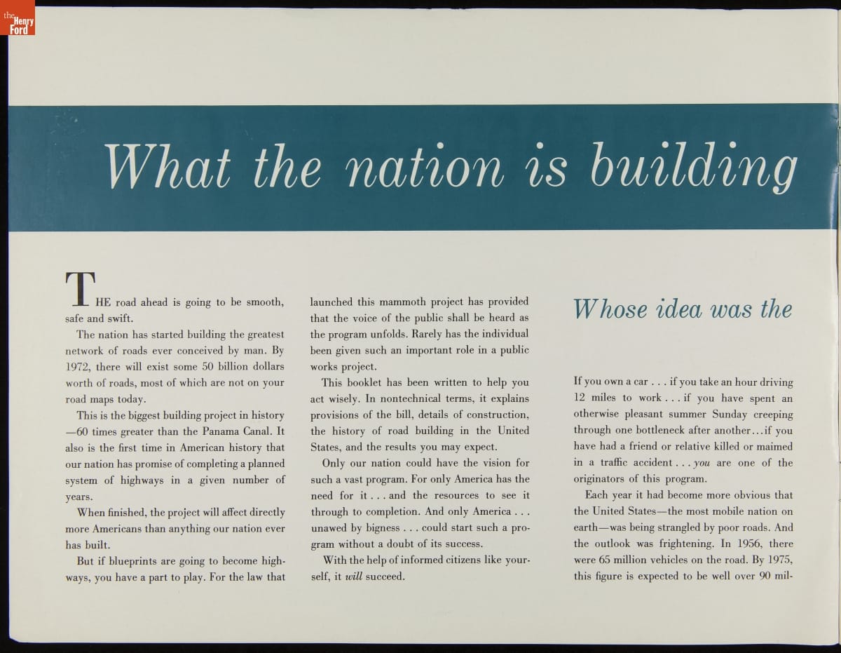 What the nation is building for you / Whose idea was the vast , new program? / Who is going to build the roads?