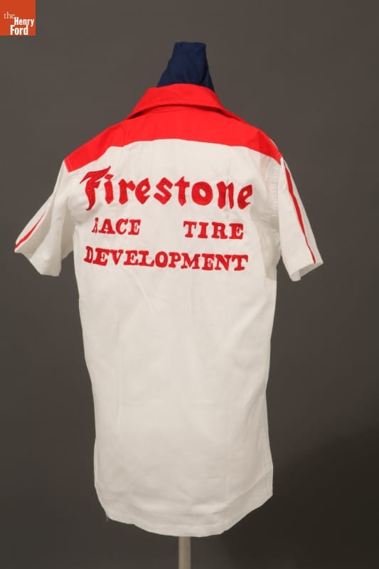 Firestone participated in auto racing almost from the company's founding in 1900. The first Indianapolis 500 winner crossed the finish line on Firestone tires in 1911 -- the start of a long relationship between Firestone and the Indy 500. This shirt belonged to George Gunlock, a Firestone tire engineer involved in Trans-Am racing.