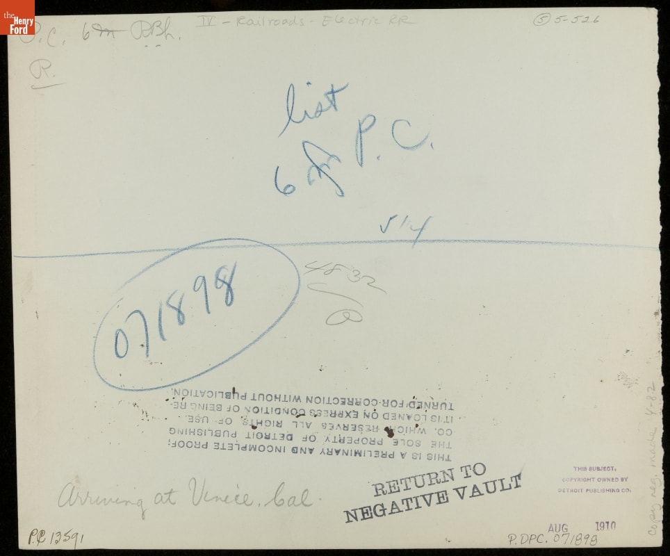 Handwritten on back in pencil:4832 / P / Arriving at Venice, Cal. Handwritten on back in grease pencil: list 6 m P.C. / 071898 Ink stamp on back reads: AUG 1910 Ink stamp on back reads: RETURN TO NEGATIVE VAULT / THIS SUBJECT, / COPYRIGHT OWNED BY / DETROIT PUBLISHING CO. / Ink stamp on back reads: THIS IS A PRELIMINARY AND INCOMPLETE PROOF; / THE SOLE PROPERTY OF DETROIT PUBLISHING / CO. WHICH RESERVES ALL RIGHTS OF USE. / IT IS LOANED ON EXPRESS CONDITION OF BEING RE- / TURNED FOR CORRECTION WITHOUT PUBLICATION On back: Photographer's negative number: 4832P Handwritten in ink lower left corner on back: P.C.13591