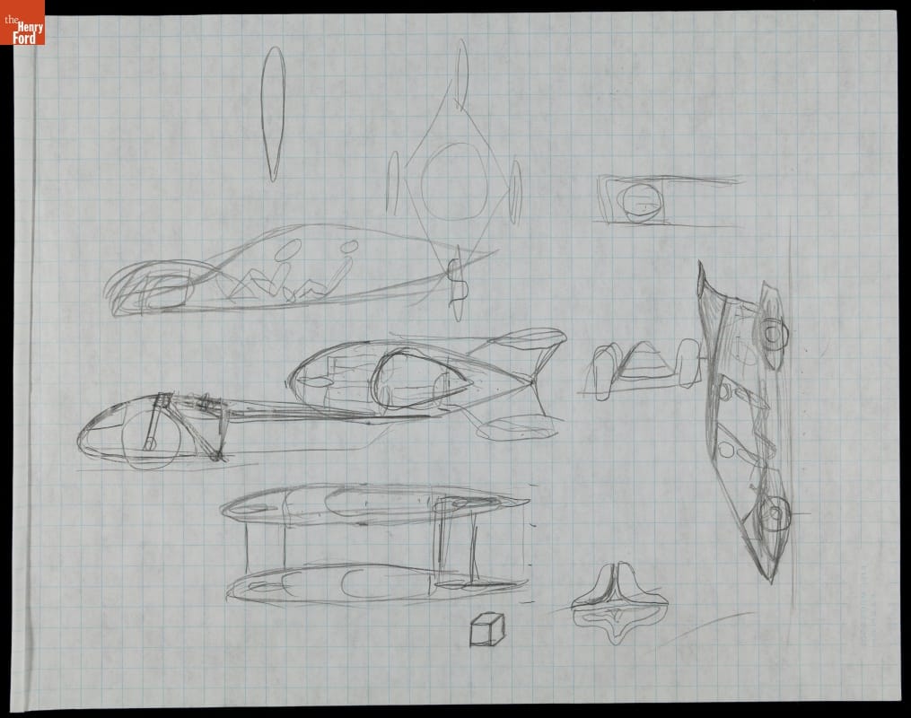 This sketch of the Edison2 was drawn freehand in a coffee shop; it might appear hasty, but its creator is an aerodynamics engineer -- an expert in stealth aircraft technology with decades of wind tunnel experience. While the next steps involved computer-aided design, rough explorations like this were crucial to the development -- and final shape -- of the Edison2.
