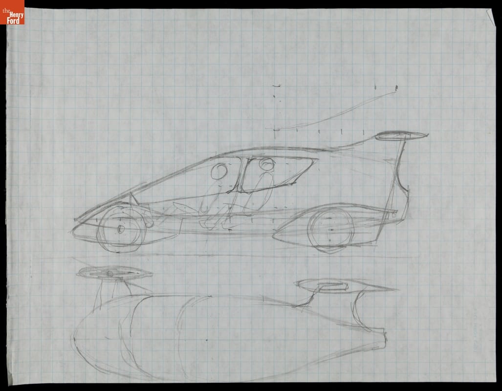 This sketch of the Edison2 was drawn freehand in a coffee shop; it might appear hasty, but its creator is an aerodynamics engineer -- an expert in stealth aircraft technology with decades of wind tunnel experience. While the next steps involved computer-aided design, rough explorations like this were crucial to the development -- and final shape -- of the Edison2.
