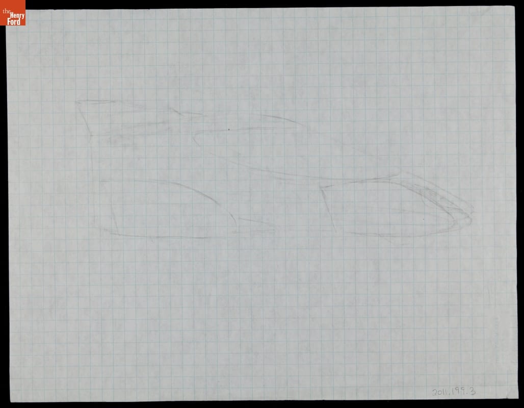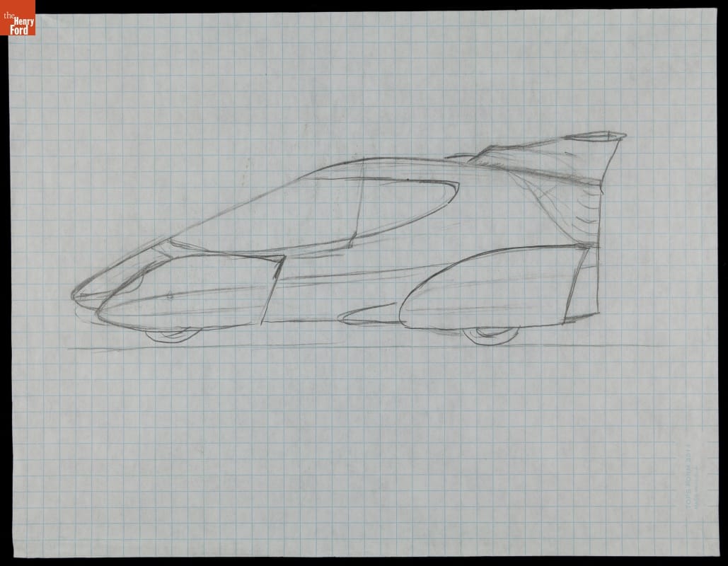 This sketch of the Edison2 was drawn freehand in a coffee shop; it might appear hasty, but its creator is an aerodynamics engineer -- an expert in stealth aircraft technology with decades of wind tunnel experience. While the next steps involved computer-aided design, rough explorations like this were crucial to the development -- and final shape -- of the Edison2.