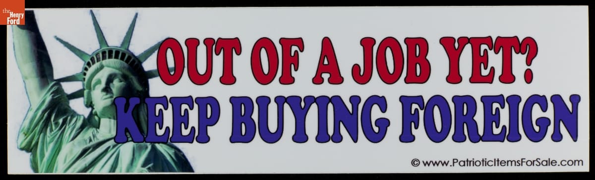 Globalization could be divisive. This bumper sticker blames the decline in domestic auto manufacturing jobs on the increasing popularity of foreign cars.