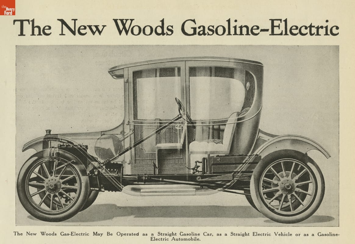The Horseless Age was an early well-known automobile journal. This volume from 1916 contains an illustration of the Woods Dual-Power car. The cutaway shows the placement of both the batteries and gasoline engine.