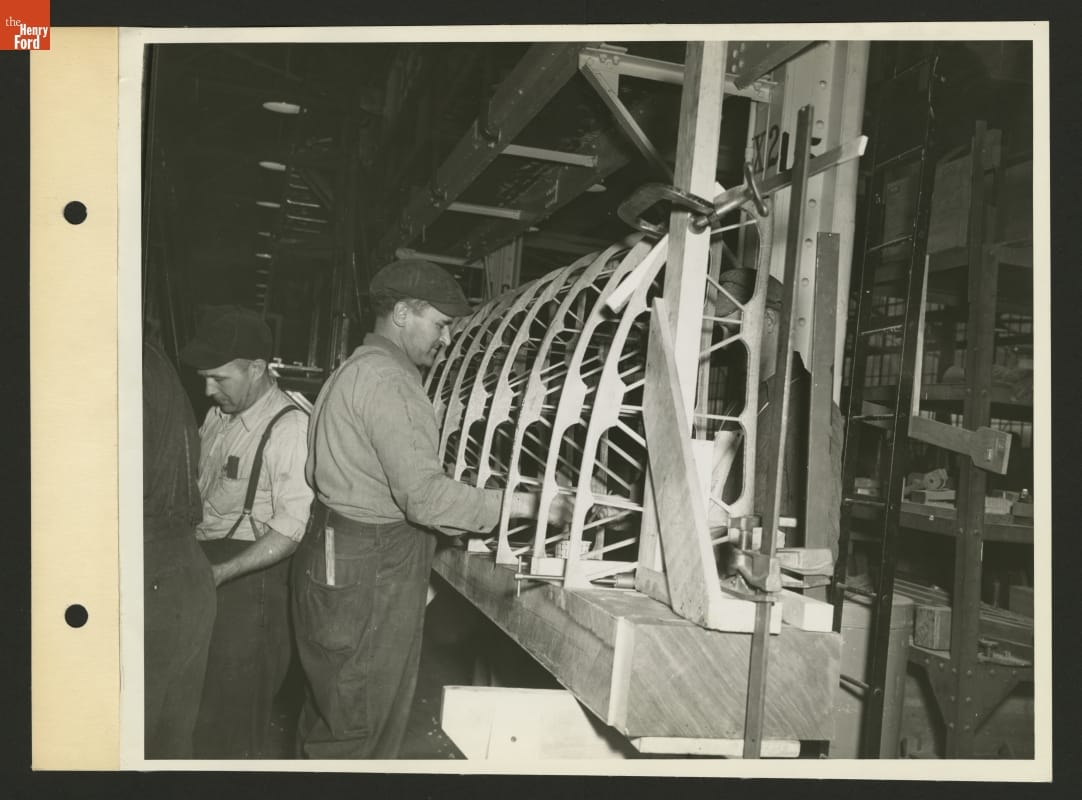 Ford's Iron Mountain plant, part of an extensive sawmill complex in Michigan's Upper Peninsula, was retooled during World War II to produce wooden CG-4A gliders for the U.S. Army. Here, workers assemble the light aircraft, which had no motor or propellers. A pilot and copilot could silently land these gliders to deliver supplies, equipment, or up to 13 additional soldiers.