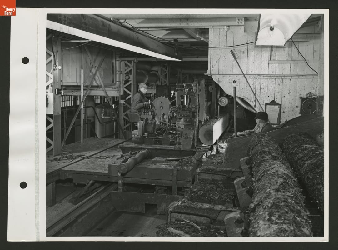 In pursuit of self-sufficient automobile manufacture, Henry Ford and Ford Motor Company purchased over 313,000 acres of timberland for logging in the Upper Peninsula of Michigan. A massive sawmill complex was constructed at Iron Mountain, including this plant which produced automotive body parts. These workers use a machine to saw huge logs for use on Ford "woody" station wagons.