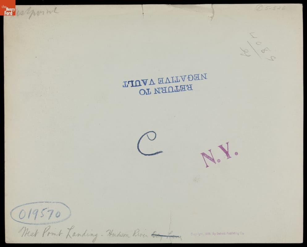 For nearly thirty years, 1895 to 1924, the Detroit Publishing Company was one of the major image publishers in the world. The company had a wide-ranging stock of original photographs, including this image taken from a Hudson River steamer. Situated on the bluff above the riverboat landing is the United States Military Academy at West Point.