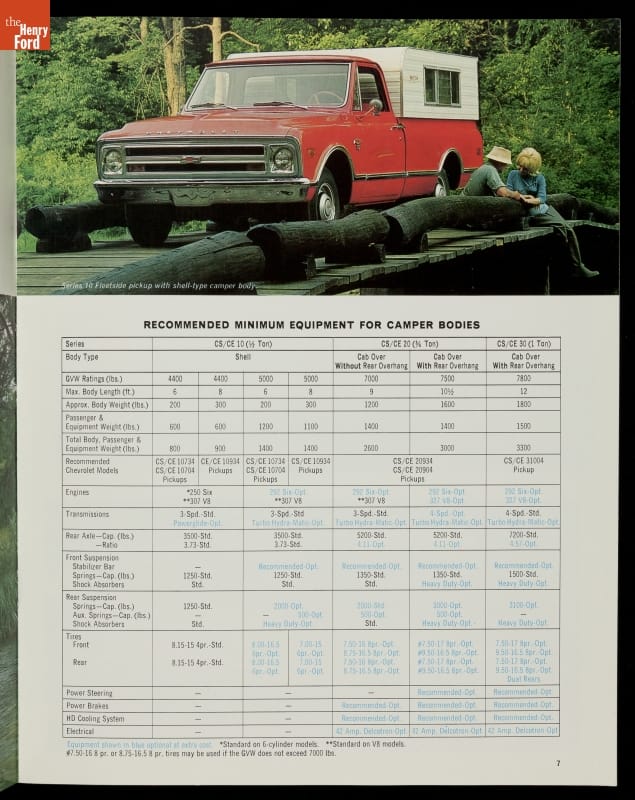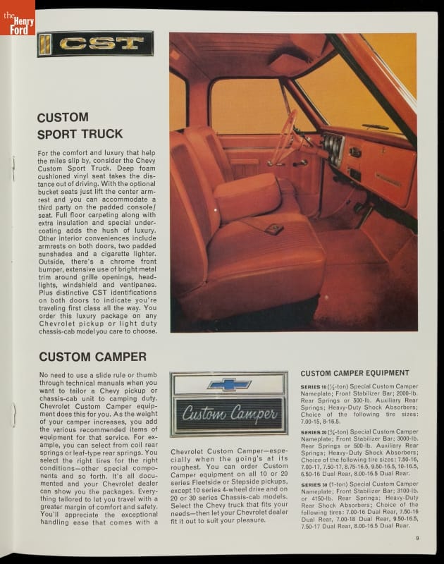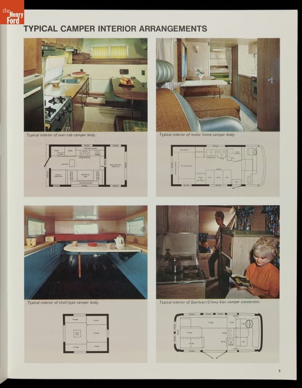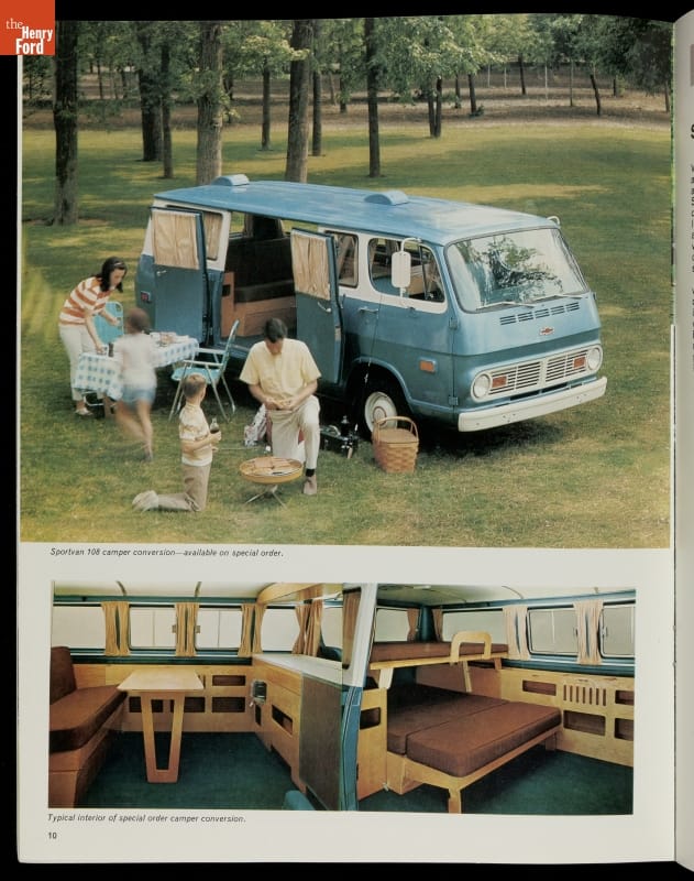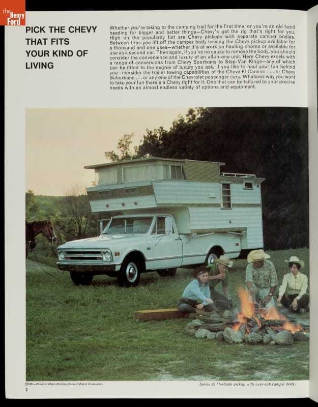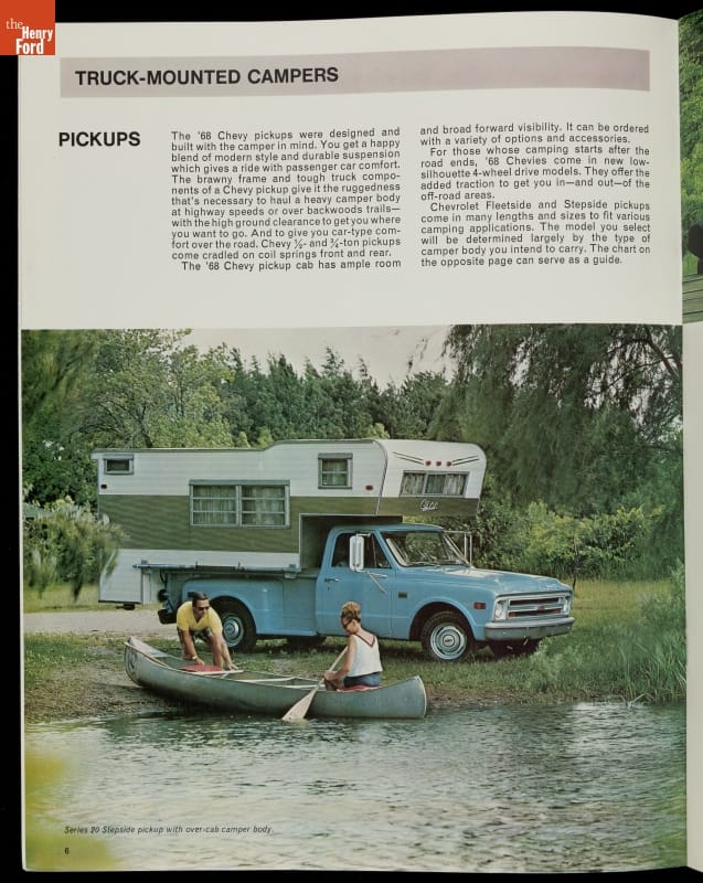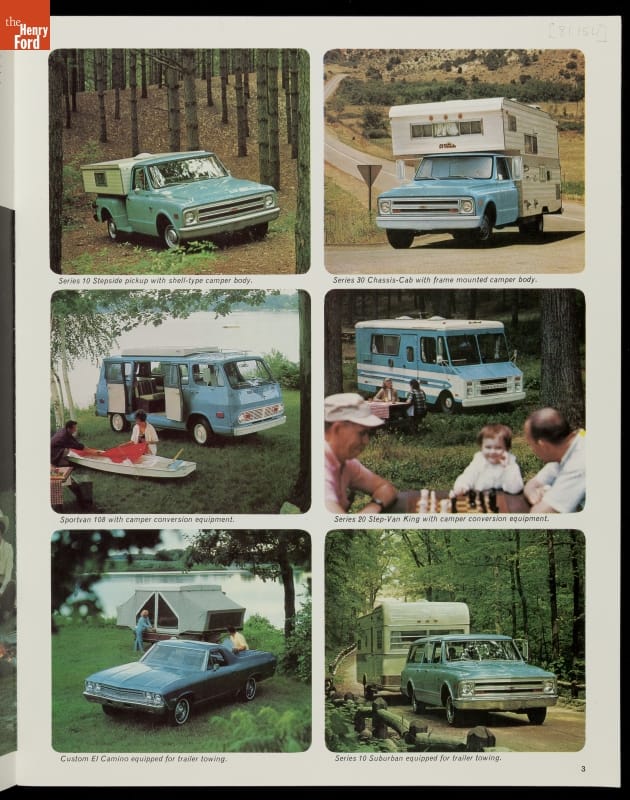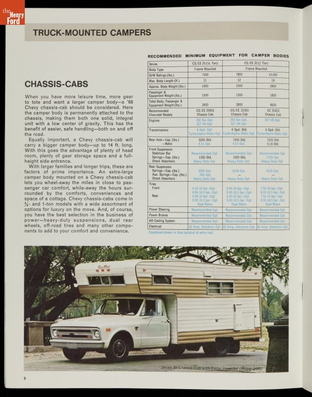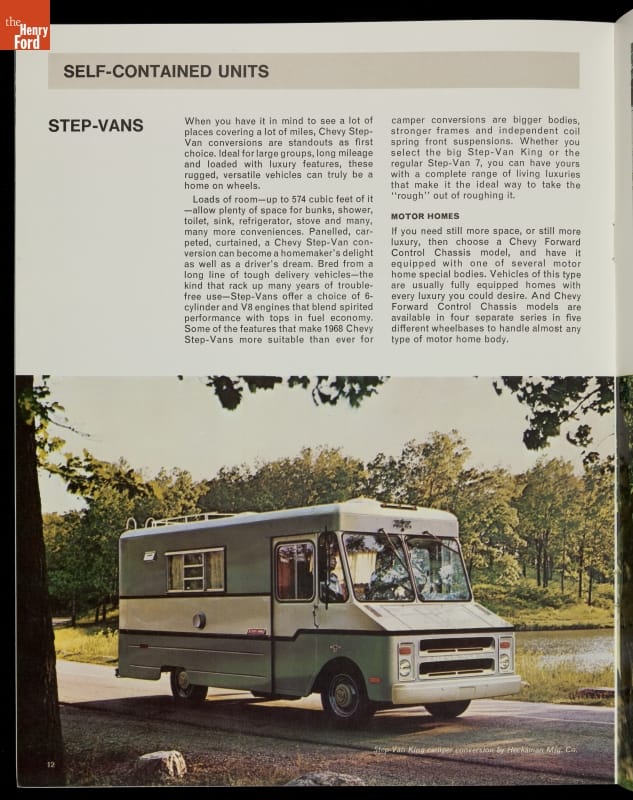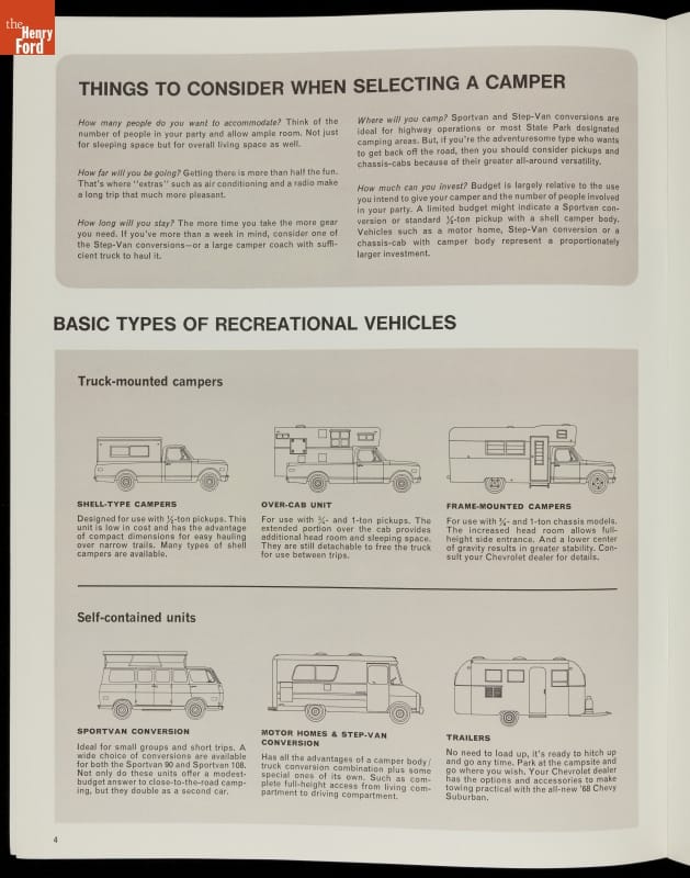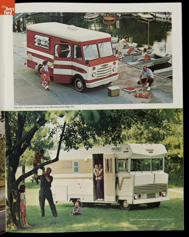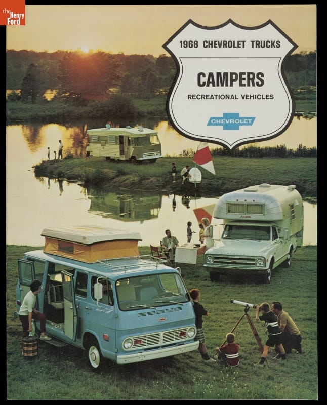 Auto manufacturers embraced the market potential of campers and motorhomes in the 1960s, creating their own versions. This 1968 Chevrolet recreational vehicle catalog provided potential buyers with needed information and a variety of available choices.
