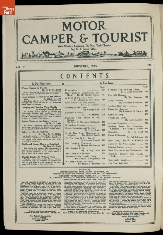 The growth of automobile ownership and development of good roads drove more Americans to explore the country in the 1920s. Motor Camper and Tourist offered advice on how and where to go. This November 1925 issue, with its idyllic view of camping on the cover, offered a number of articles, advice, and product advertisements on motor camping.