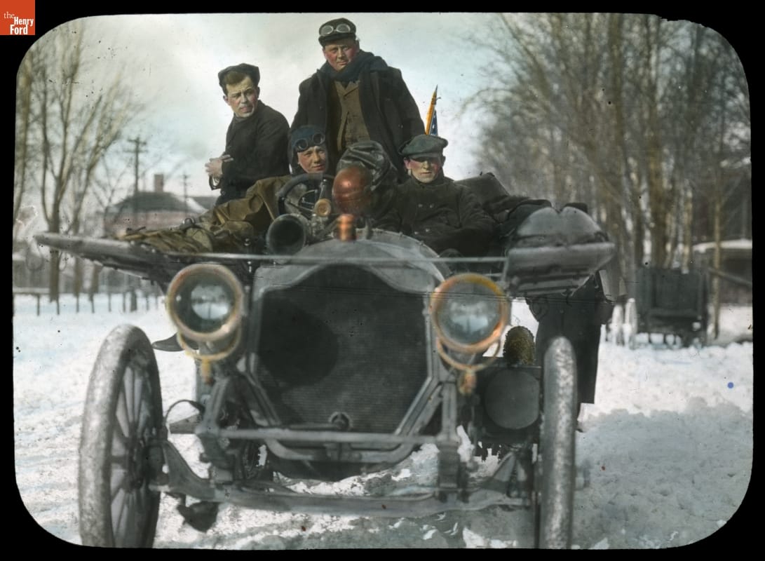 In 1908, an American-built Thomas Flyer won the New York to Paris automobile race. The race took 169 days, covered 22,000 miles and spanned three continents. The American team was declared the winner. This lantern slide image shows the 1907 Thomas Flyer with passengers traversing the snow and cold somewhere in New York State.