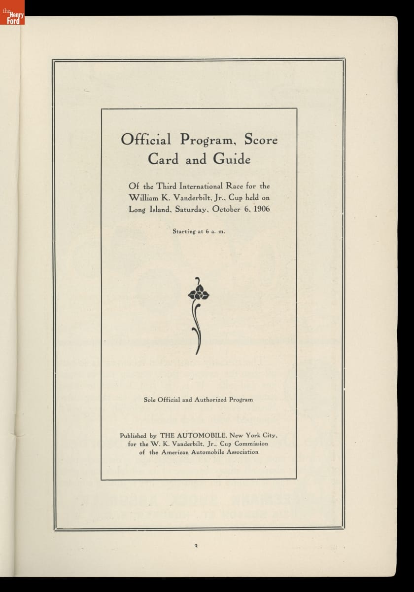OFFICIAL / PROGRAM, SCORE-CARD AND GUIDE / OF THE / THIRD INTERNATIONAL RACE / FOR THE / WILLIAM K. VANDERBILT, JR. / CUP / LONG ISLAND / October 6 / 1906