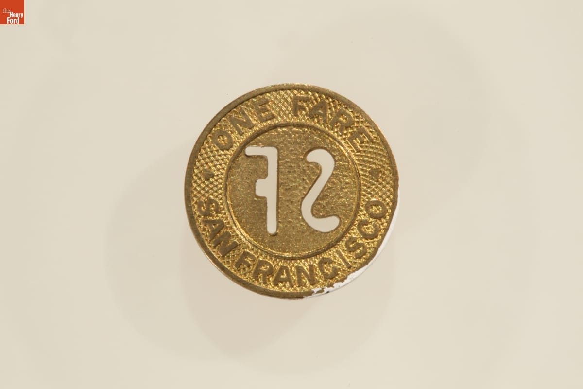 This token is good for one fare on the buses, streetcars, and trolleys run by "Muni," San Francisco's public transit agency.