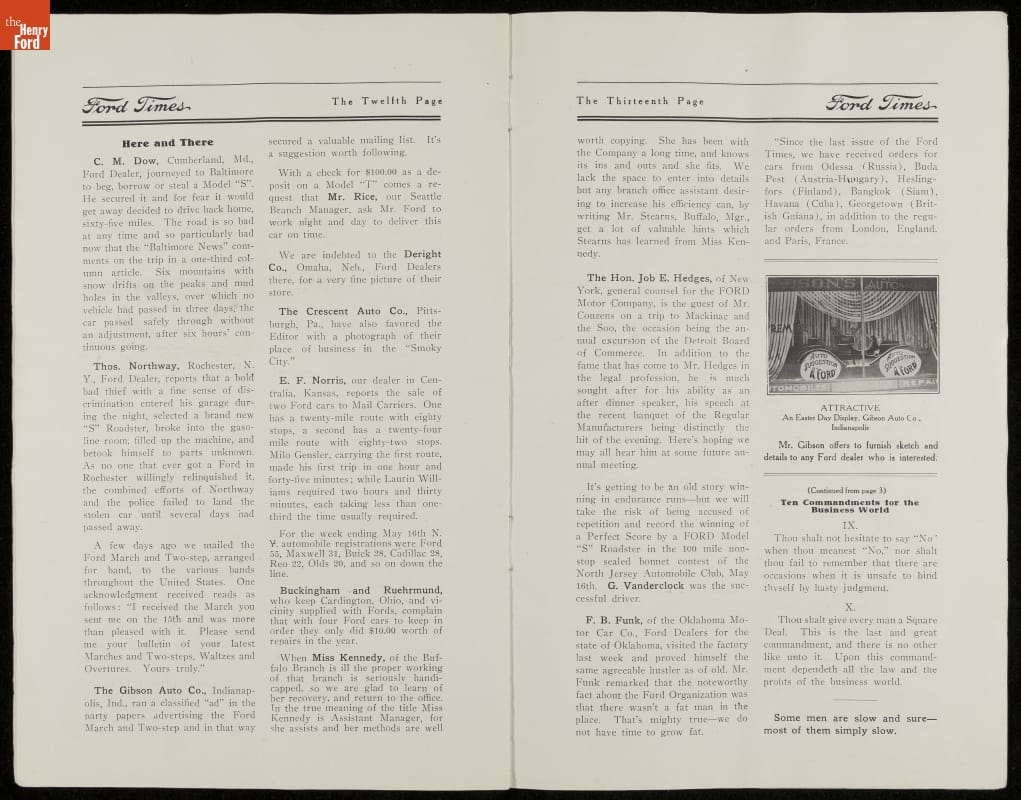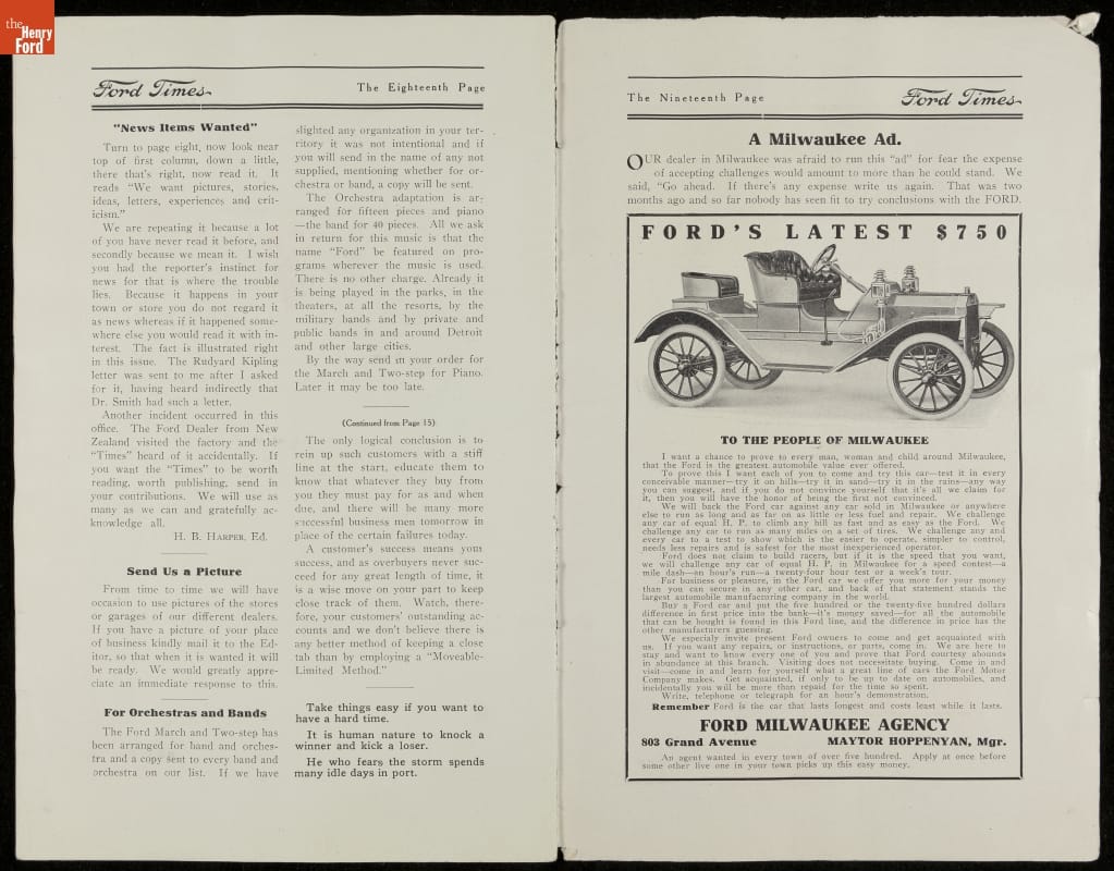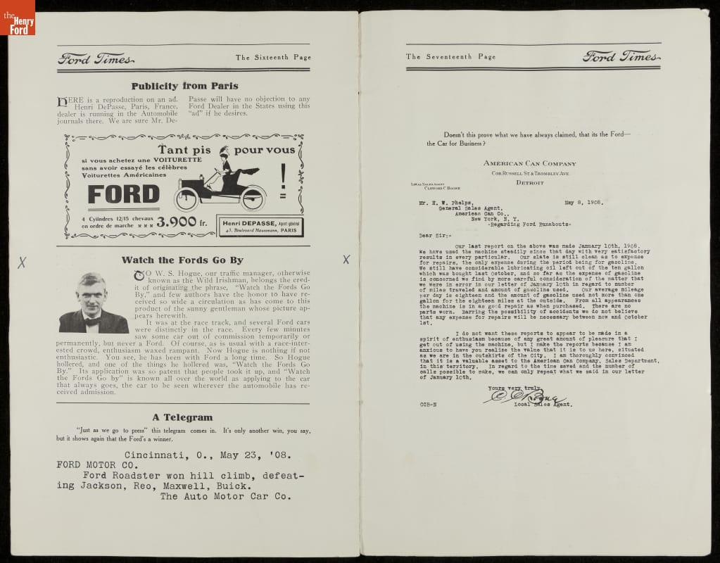 Ford Times was a publication dedicated to promote Ford Motor Company. The magazine relied on its local car dealers and company employees to supply news, photographs, and advertising ideas. A dealer in Medicine Hat, Alberta, Canada, provided the letter from Rudyard Kipling found on the cover of this June 1908 issue.