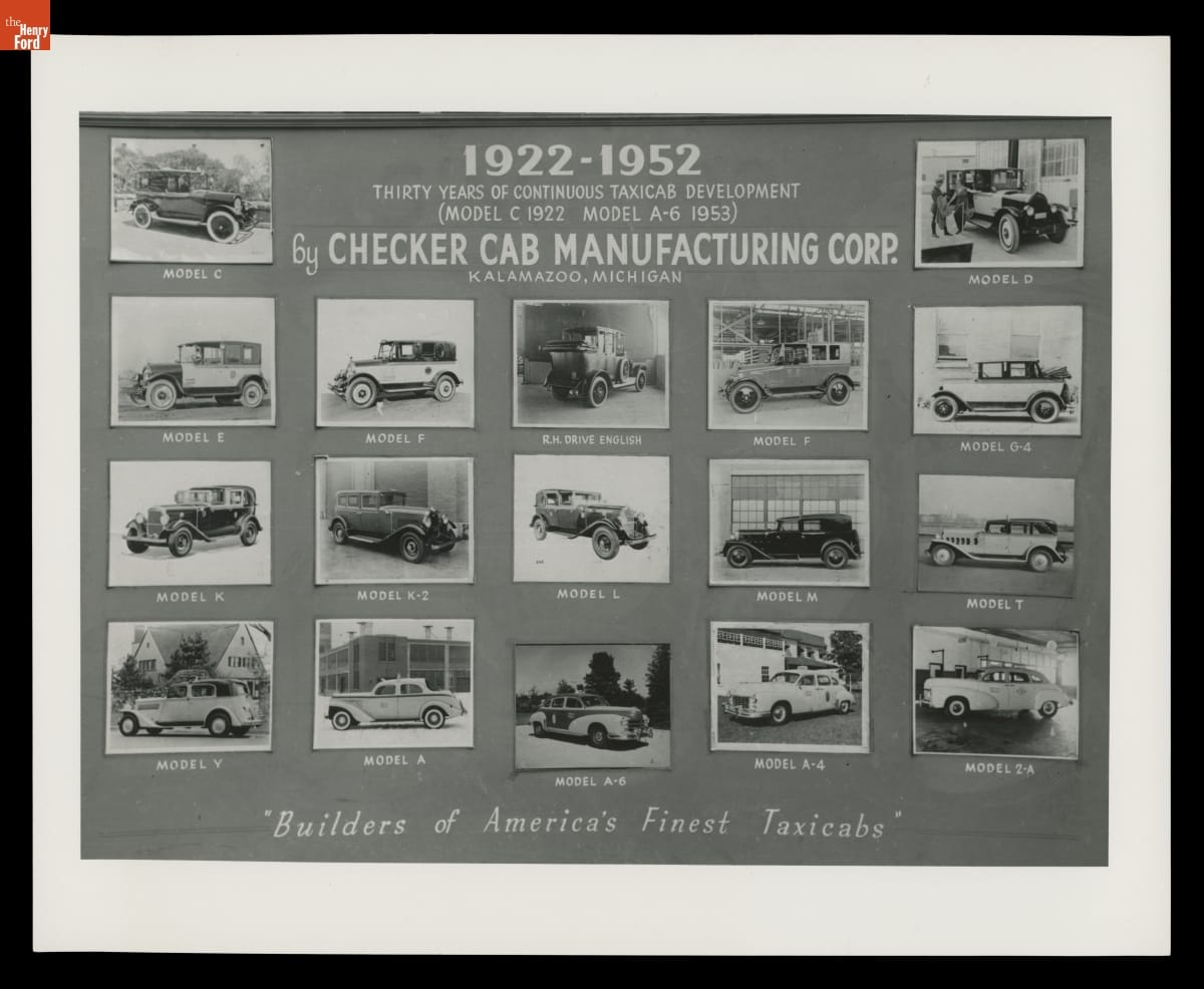 Checker Cab Manufacturing Corporation, the self-proclaimed "Builders of America's Finest Taxicabs," produced cabs in Kalamazoo, Michigan, from 1922 to 1982. This image celebrates taxicab models built during the company's first 30 years in business. Checker's spacious, purpose-built cabs offered convenient point-to-point transportation to paying customers around the country.