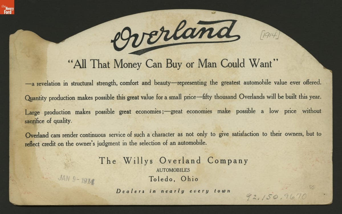 Text on back of display card: Overland / "All That Money Can Buy or Man Could Want" / ... The Willys Overland Company / Automobiles / Toledo, Ohio / Dealers in nearly every town
