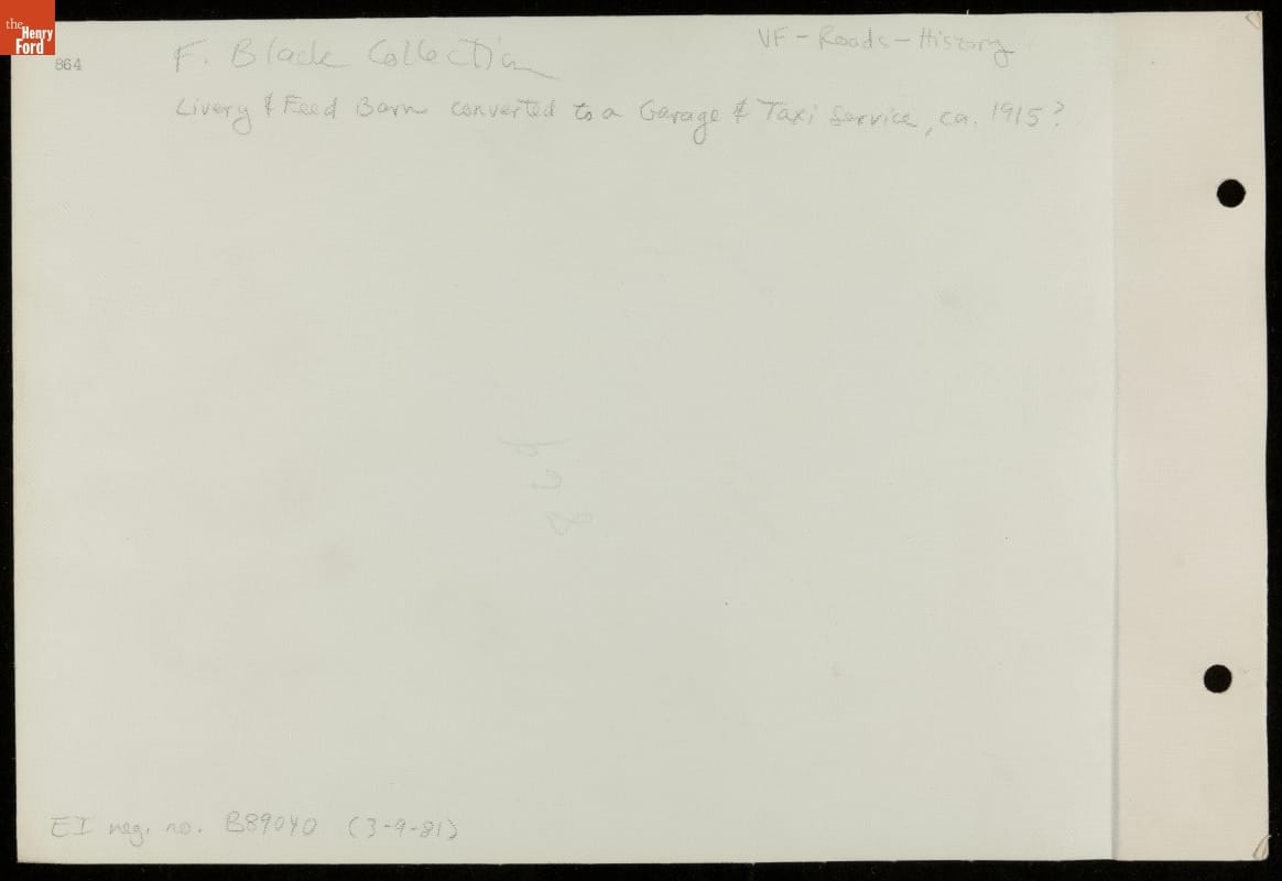 verso: F. Black Collection. Livery & Feed Barn converted to a Garage & Taxi Service, ca. 1915? E.I. neg. no. B89040 (3-9-81)
