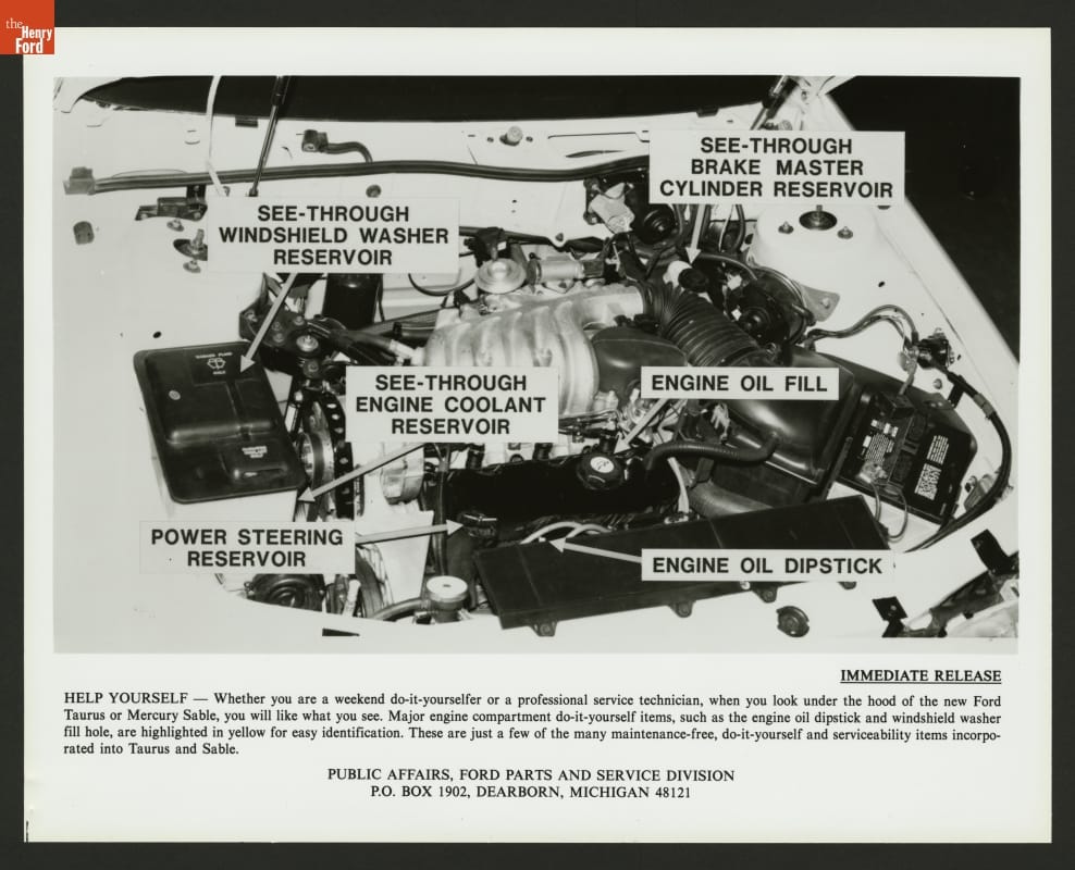 HELP YOURSELF-- Whether you are a weekend do-it-yourselfer or a professional service technician, when you look under the hood of the new Ford / Taurus or Mercury Sable, you will like what you see. Major engine compartment do-it-yourself items, such as the engine oil dipstick and windshield washer / fill hole, are highlighted in yellow for easy identification. these are just a few of the many maintenance-free, do-it-yourself and serviceability items incorporated / into Taurus and Sable.