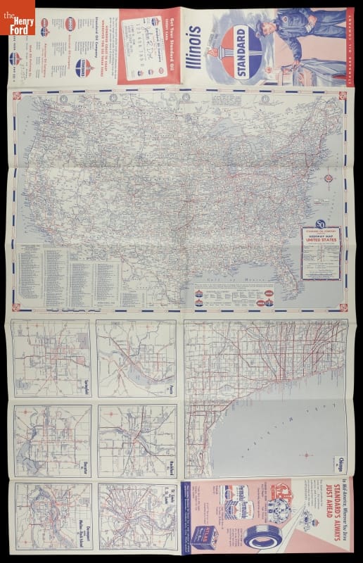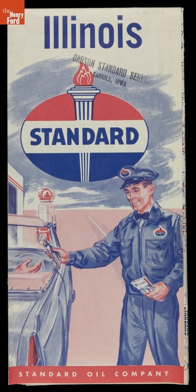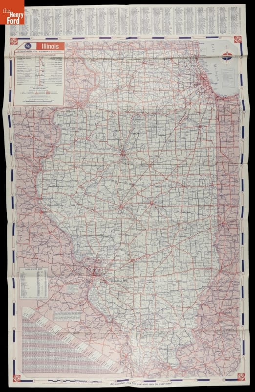 Along with the regular automobile service provided by gasoline stations, travelers during the early and mid-20th century could usually find a free road map. Standard Oil supplied this map of Illinois to motorists at their stations.