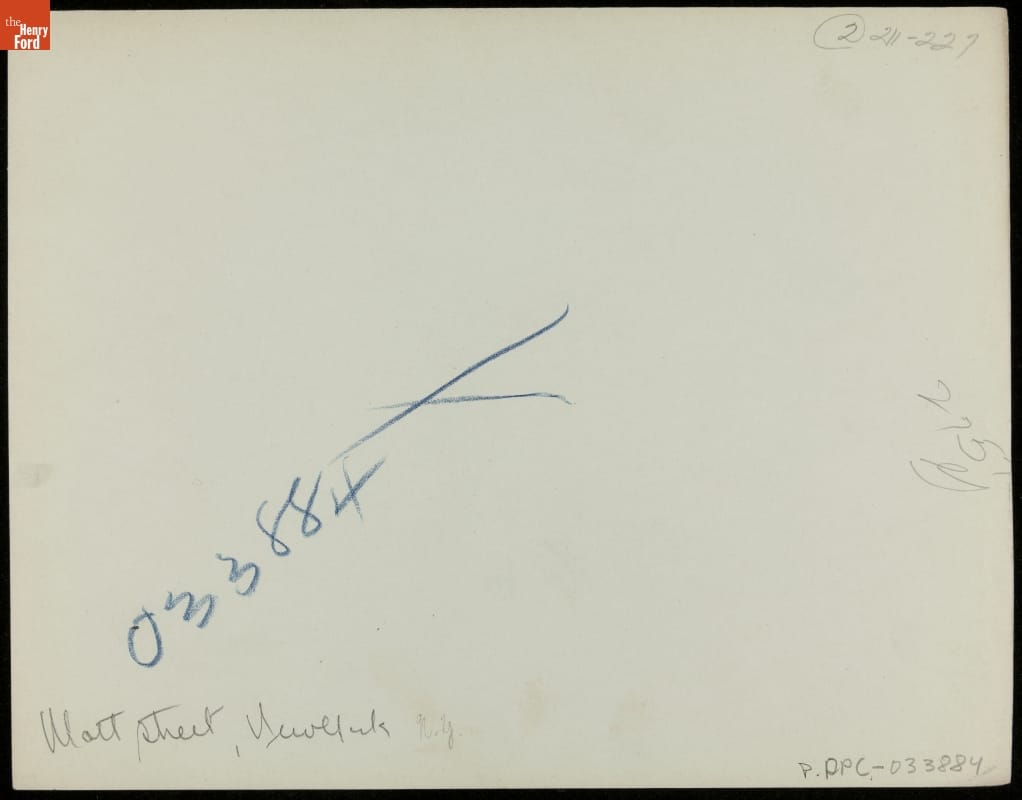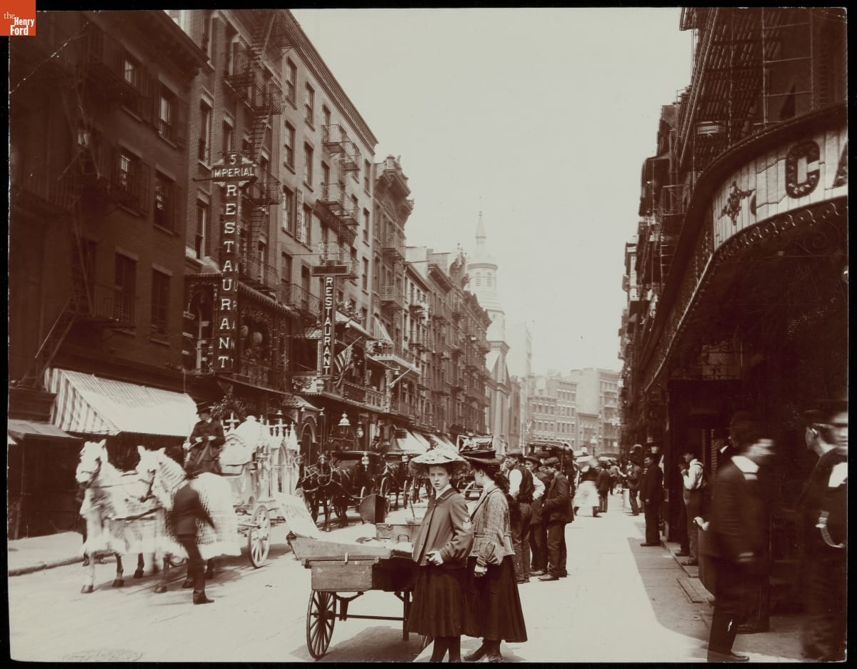 A horse-drawn hearse drives down Mott Street while two young girls peddle peanuts from a pushcart on a busy day in Manhattan's Chinatown. Across the street (right) is the Imperial Restaurant, one of the first Chinese restaurants in New York City.