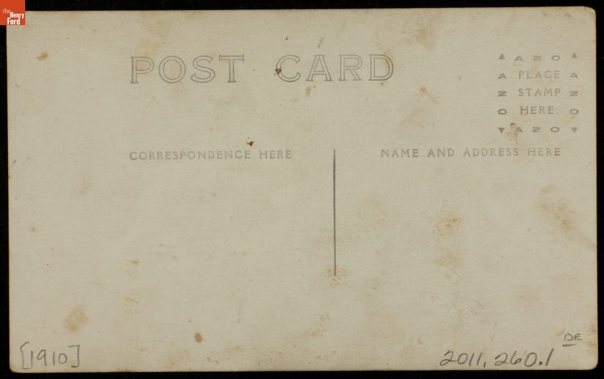 This man likely decided at the spur-of-the-moment to have his photograph taken. He has left his tie tucked in as he would while wearing a work apron. He probably saw the temporary set-up by a traveling photographer of a painted canvas in a store or public building. Choosing postcard paper meant that he could mail photos to friends and relatives.