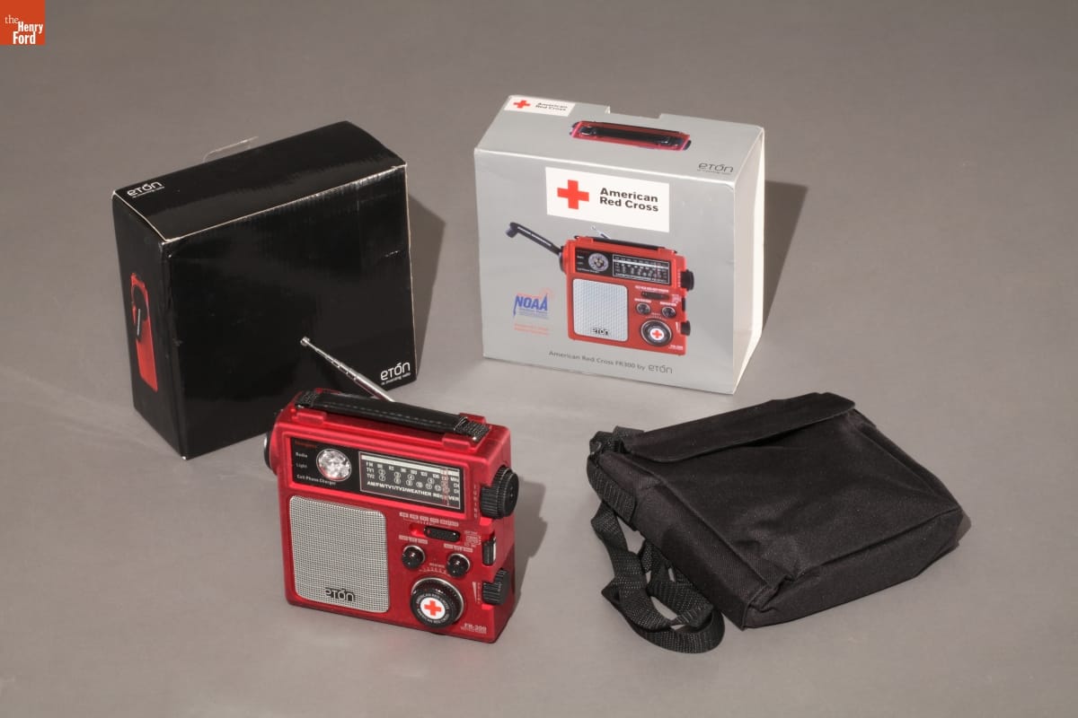 Bottom of outer box: DESIGNED BY ETON CALIFORNIA AND ASSEMBLED IN CHINA | COPYRIGHT 2007 ETON CORPORATION. ALL RIGHTS RESERVED. THE AMERICAN RED CROSS LOGO IS REGISTERED TRDEMARKS OWNED BY THE AMERICAN RED CROSS. OFFIVIALLY LICENSED PRODUCT OF THE AMERICAN RED CROSS. / V.071907 Back of outer packaging: FR300 / AM/FM RADIO WITH NOAA, TV-VHF, FLASHLIGHT, AND CELL PHONE CARGER (SIC) / HAND CRANK POWER GENERATOR [...] Radio front: Emergency / radio / Light / Cell Phone Charger / eton / FR-300 / Recycle Power