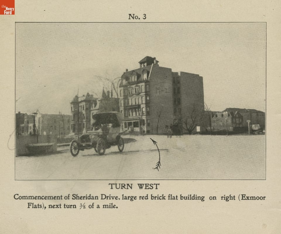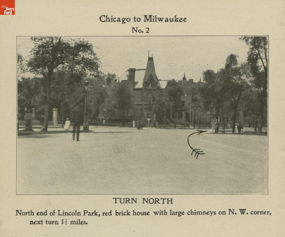 Early travel guides used hand-drawn arrows on photographs to direct drivers to their destinations. A Photographic Automobile Map from 1905 helped motorists unfamiliar with the route navigate from Chicago to Milwaukee.