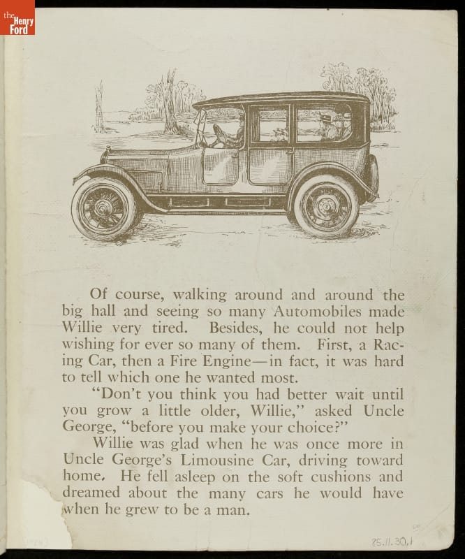 Little Willie and Uncle George visit an automobile show in this 1924 children's book. Willie is excited about all the cars he sees (each with a colorful illustration) and Uncle George explains the different features. And like most little boys (and girls) after visiting an auto show, he falls asleep and dreams of the cars he would have when he grows up.
