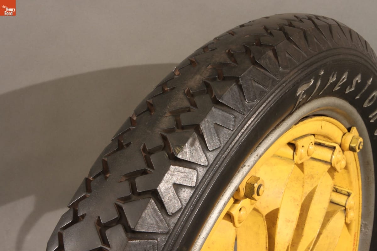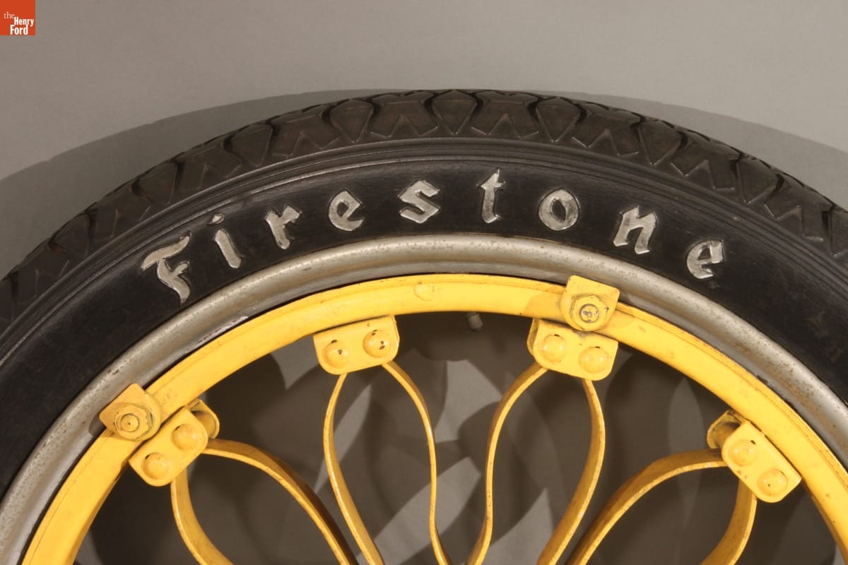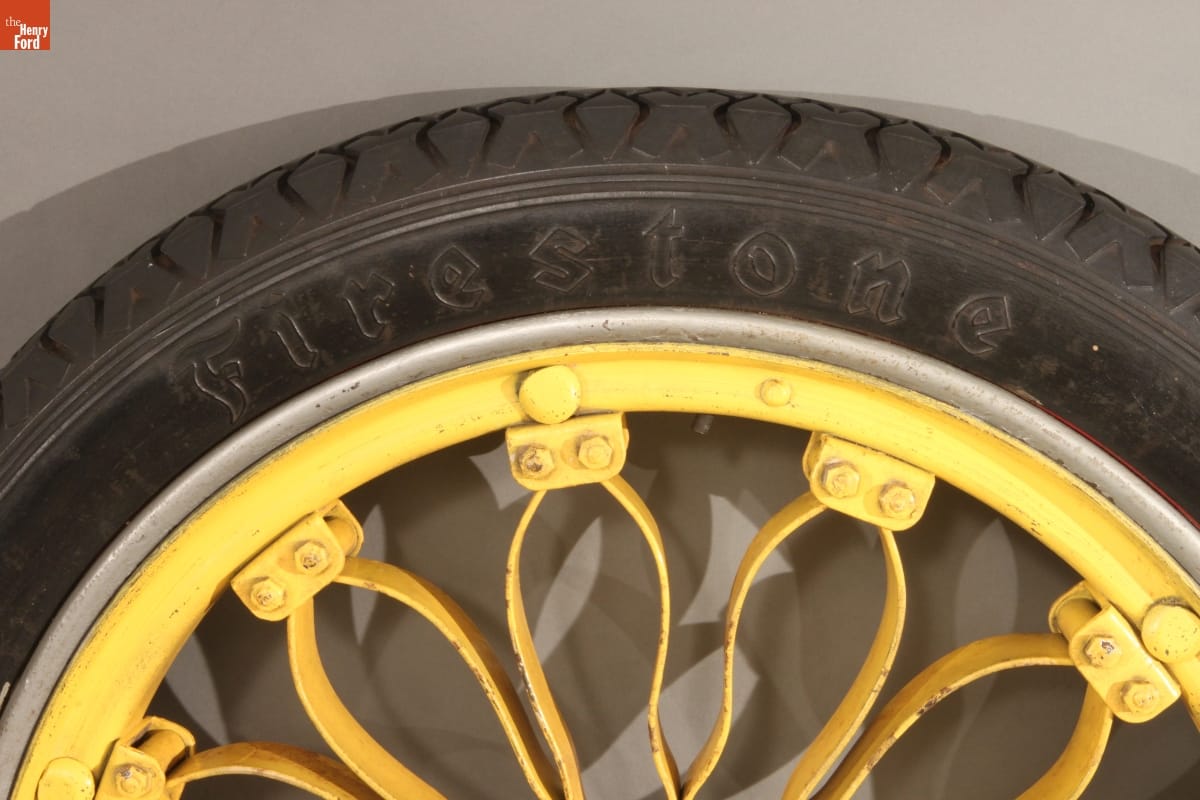 These two tires are mounted on a pair of spring wheels. Instead of spokes, the wheel hubs are connected to the rims with leaf springs. The wheels were intended to supplement the Model T's own suspension in absorbing shocks from the road. Ford Motor Company never sold Model T spring wheels to the public, but some aftermarket manufacturers did.