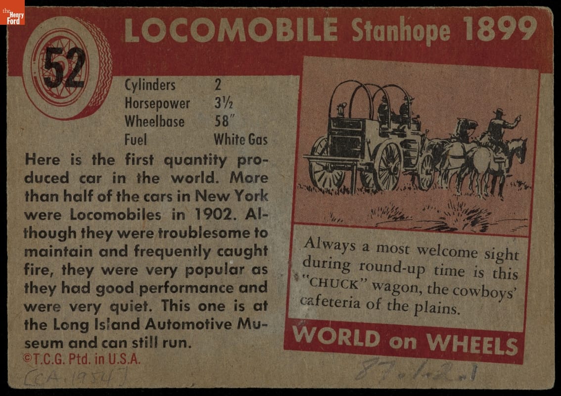 Topps "World on Wheels" Series, 1899 Locomobile Stanhope, circa 1954