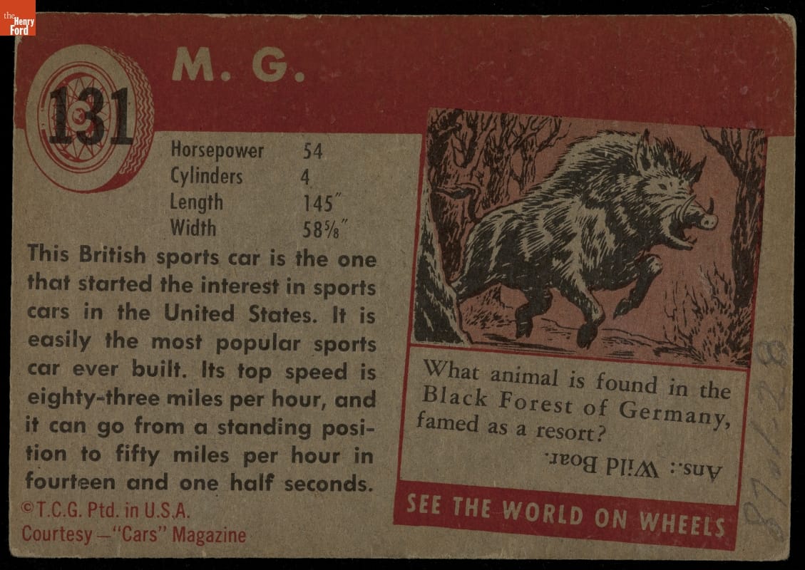 The Topps Chewing Gum Company produced a series of vehicle trading cards in the 1950s. Now known as the "World on Wheels" set, the face of the card depicted an historic or modern car, truck, or other vehicle. The back contained interesting facts about the vehicle and usually a trivia question or information about transportation, roads, or traffic safety.