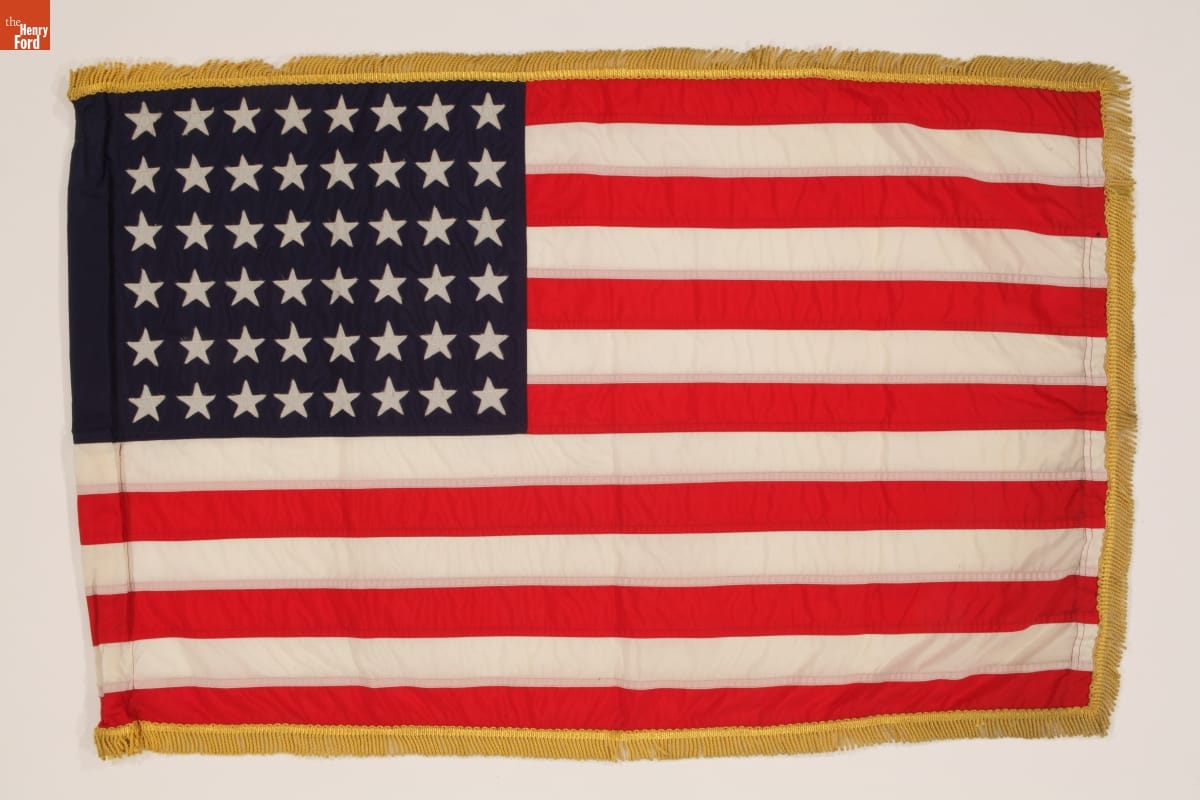 United States Secret Service agent Morgan L. Gies was responsible for White House vehicles from 1941 to 1967. This American flag from his personal collection flew on the presidential limousines of both Franklin D. Roosevelt and Harry S. Truman. Its 48 stars represent the United States of America before the admission of Alaska and Hawaii in 1959.