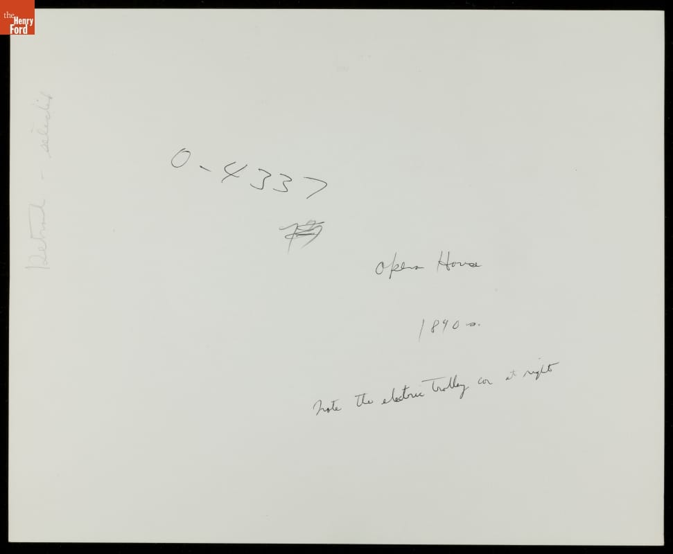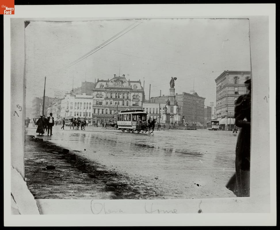 The first Detroit Opera House stands behind a horse-drawn streetcar at Campus Martius, a former military training ground that became the "point of origin" of Detroit's coordinate street system and site of the Michigan Soldiers' and Sailors' Monument. Electric streetcar lines (note the wires strung above the streets) coexisted with horsecars in turn-of-the-ninteenth-century Detroit.