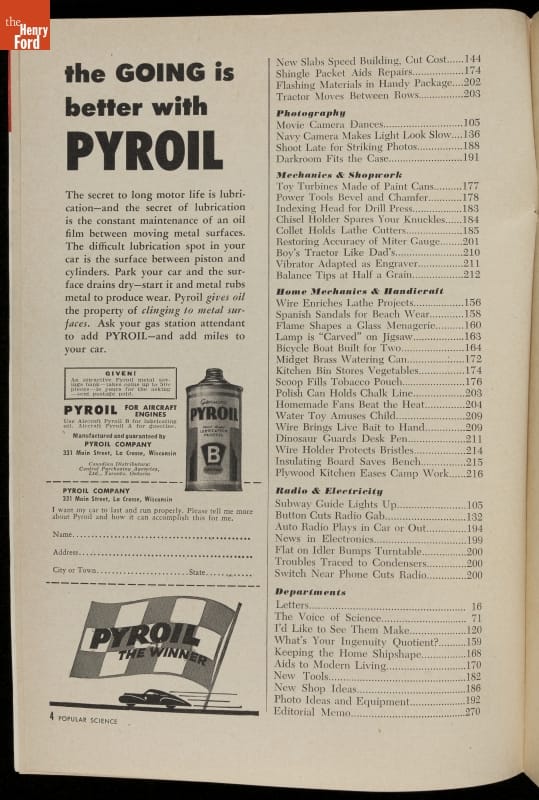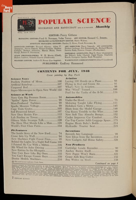 Popular Science provided information about scientific and technological advancements. In the early 1900s articles about the automobile -- and its driver -- became commonplace in the monthly's pages. This July 1948 issue contains articles about the new Ford, automobile tires, new automotive innovations, and driver safety issues.