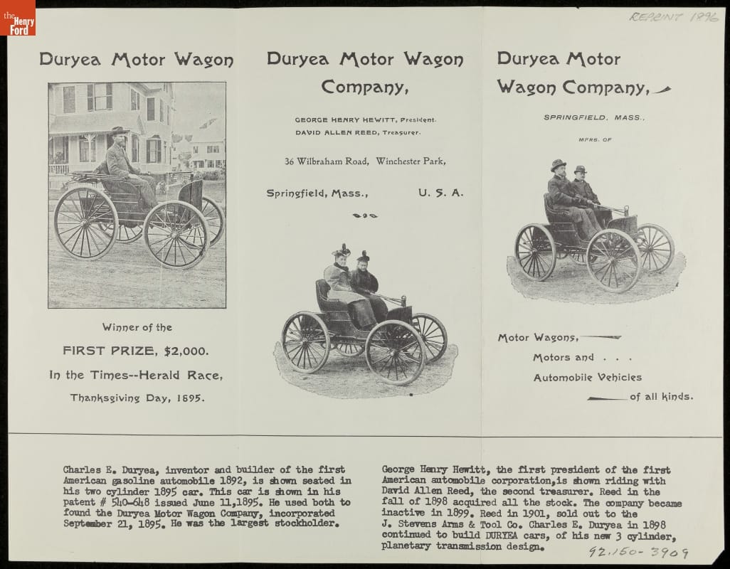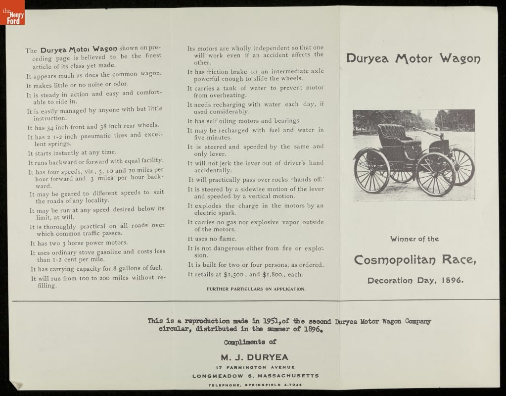 The Duryea Motor Wagon Company, run by Charles and Frank Duryea, became the first in America to produce a series of identical vehicles. This accomplishment marked the beginning of the U.S. auto industry. M. J. Duryea, son of Charles Duryea, reproduced one of the original 1896 company brochures and made it available to automobile enthusiasts.
