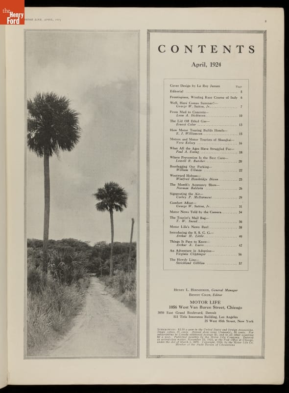 The growth of automobile ownership and development of good roads drove more Americans to explore the country in the 1920s. Motor Life offered a number of interesting articles for the motor tourists. Readers of this issue could learn about the road building progress in Illinois -- one state that many travelers may have to pass through on their vacations.