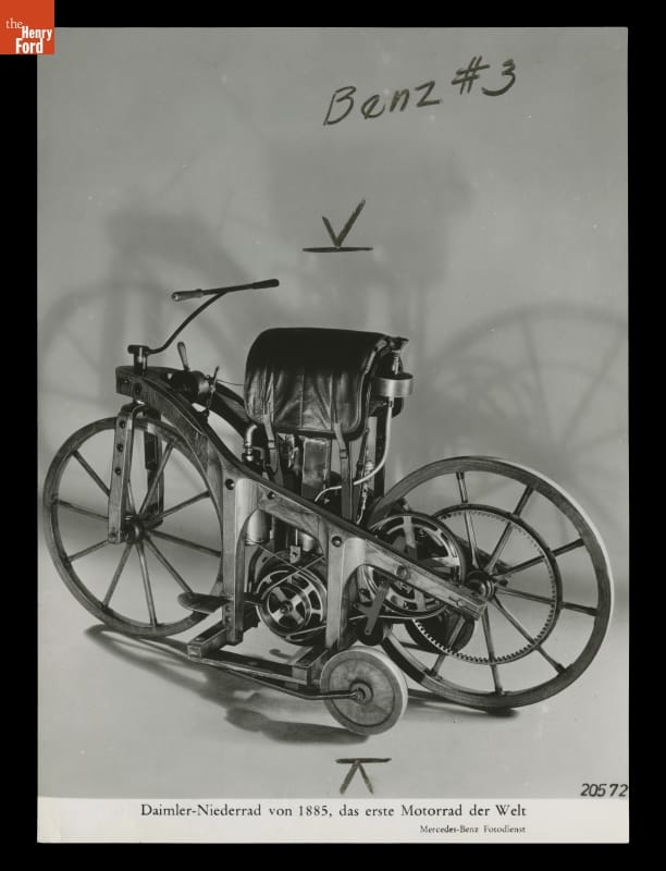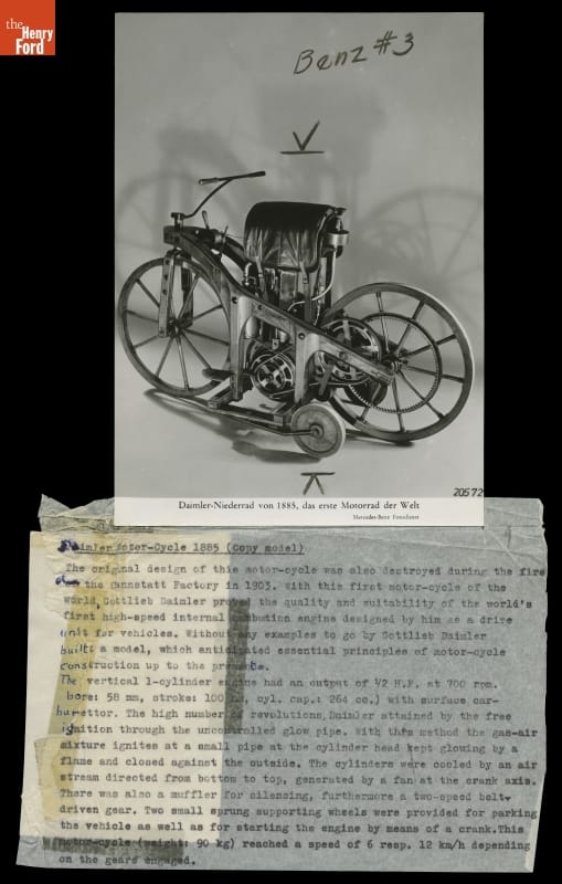 Text printed below image: Daimler-Niederrad von 1885, das erste Motorrad der Welt / 20572 / Mercedes-Benz Fotodienst Handwritten on image: Benz #3 Handwritten in pencil on back: Apr 1955 Typewritten sheet affixed to photo reads: [...nger Cars / Daimler Motor-Cycle 1885 (Copy model) / The original design of this motor-cycle was also destroyed during the fire / at the Cannstatt Factory in 1903. With this first motor-cycle of the / world, Gottlieb Daimler proved the quality and suitability of the world's / first high-speed internal combustion engine designed by him as a drive / unit for vehicles. Without any examples to go by Gottlieb Daimler / built a model, which anticipated essential principles of motor-cycle / construction up to the present. / The vertical 1-cylinder engine had an output of 1/2 H.P. at 700 rpm. / ( bore: 58 mm, stroke: 100 mm, cyl, cap: 264 cc.) with surface carberettor (sic). The high number of revolutions Daimler attained by the free / ignition through the uncontrolled glow pipe. With this method the gas-air / mixture ignites at a small pipe at the cylinder head kept glowing by a / flame and closed against the outside. The cylinders were cooled by a / flame and closed against the outside. The cylinders were cooled by an air / stream directed from bottom to top, generated by a fan at the crank axis. There was also a muffler for silencing, furthermore a two-speed belt- / driven gear. Two small sprung supporting wheels were provided for parking / the vehicle as well as for starting the engine by means of a crank. This / motor-cycle (weight: 90 kg) reached a speed of 6 resp. 12 km/h depending / on the gears engaged.