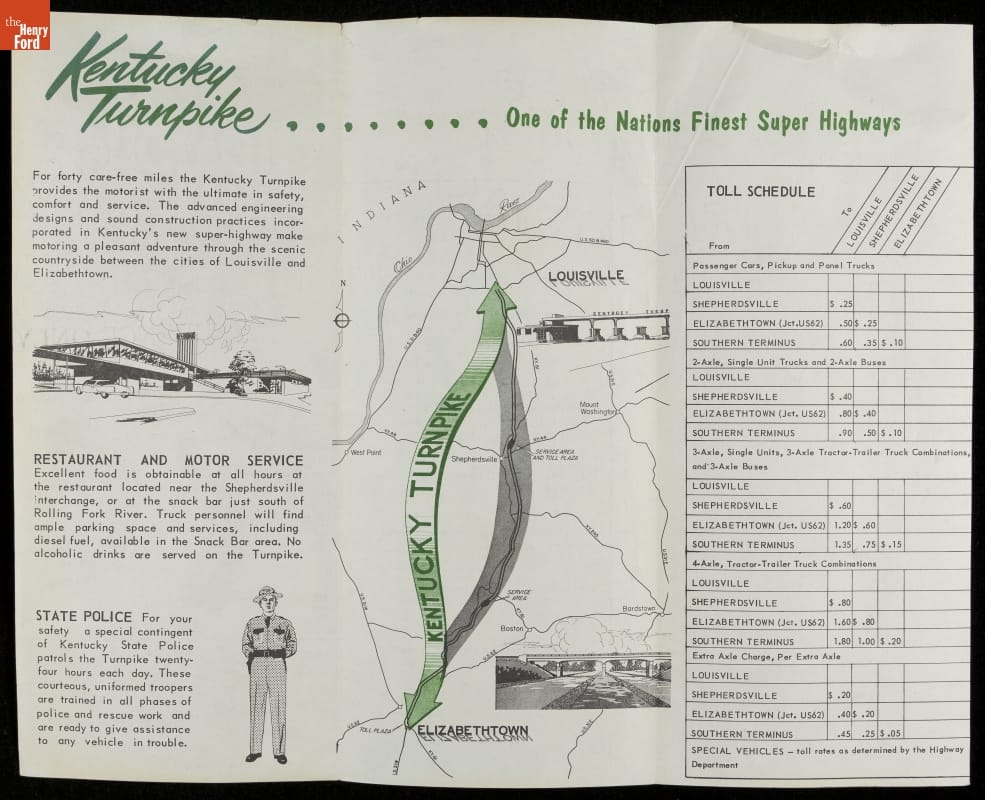 In the mid-20th century a number of states sponsored turnpikes and other toll roads to provide a quick, safe and comfortable travel experience for motorists. In 1956, Kentucky opened the Kentucky Turnpike from Louisville to Elizabethtown. For a small fee, motorists could make the forty-mile trip on a modern road with "No Stop signs. No Cross traffic. [and] No Slow-downs."