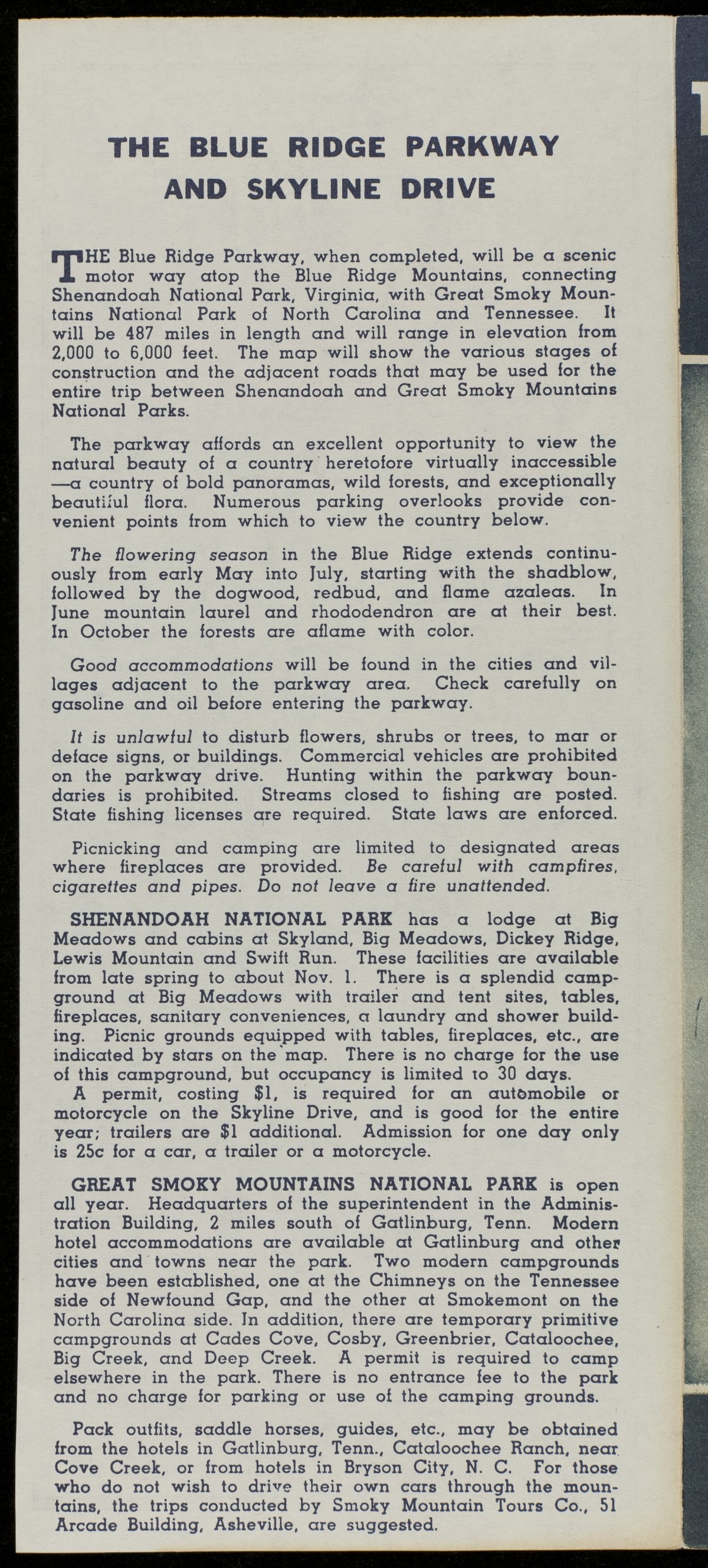 The Blue Ridge Parkway links Shenandoah National Park in Virginia to the Great Smoky Mountains National Park in North Carolina. The 469-mile scenic Skyline Drive offers panoramic views of the surrounding countryside. The Blue Ridge Parkway, often referred to as "America's Favorite Drive," has been one of the most visited parks since 1946, when this brochure was printed.
