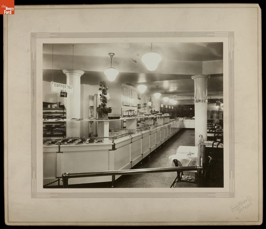 Baker Henry J. Boerth and his family opened their first restaurant on Woodward Avenue in 1894. By 1919, Boerth's Lunch Company owned and operated four restaurants in Detroit, although the company was out of business by 1923. This is the interior of one of Boerth's Restaurants in about 1920.