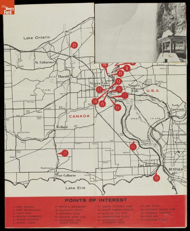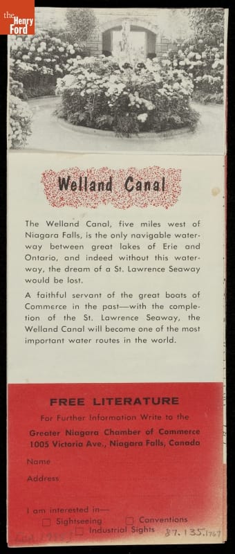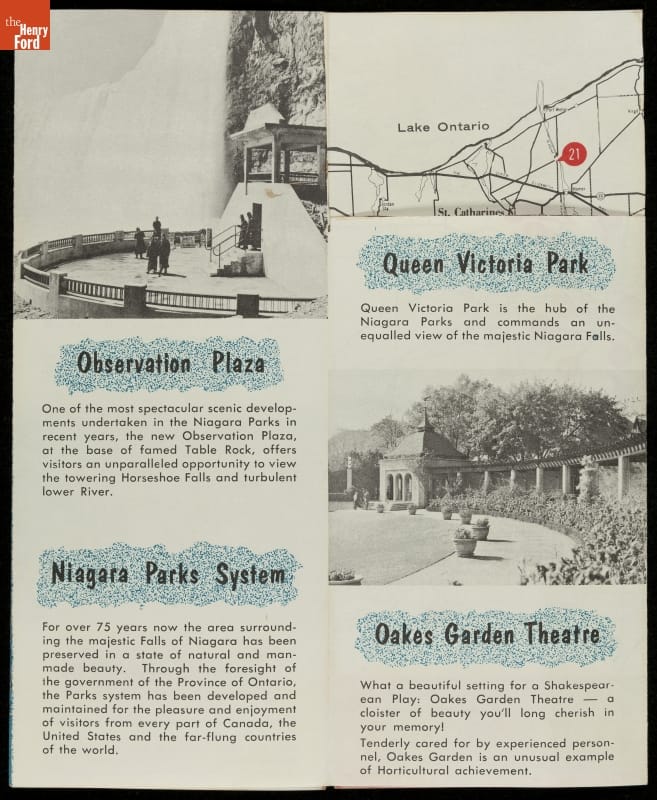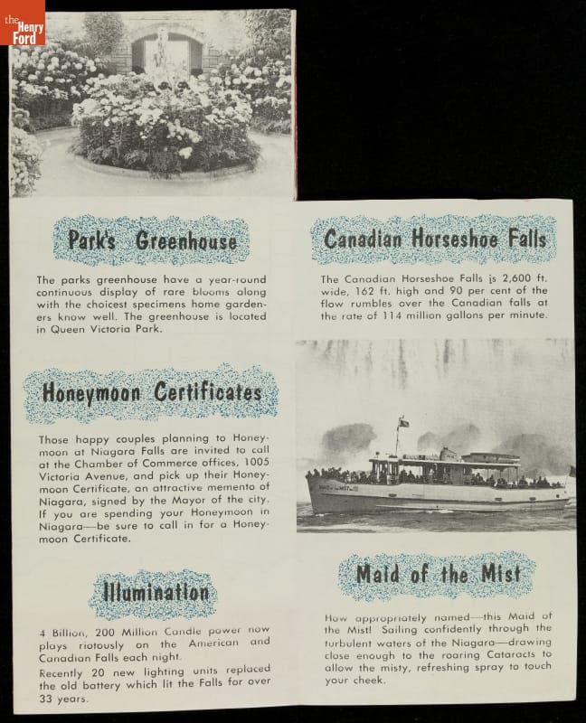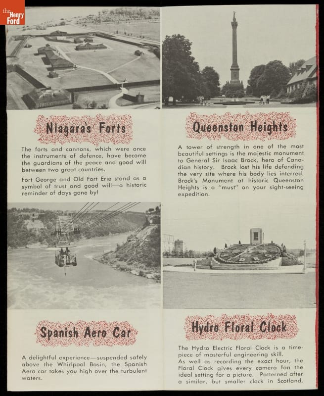 Visitors had sightseeing options when visiting Niagara Falls, Ontario, Canada. This vacation destination offered "so much to see and so much to do," according to this 1950s brochure. In addition to the famous waterfalls, tourists could walk or drive to other points of interest, including the Welland Canal, Queen Victoria Park, or the Hydro Floral Clock.