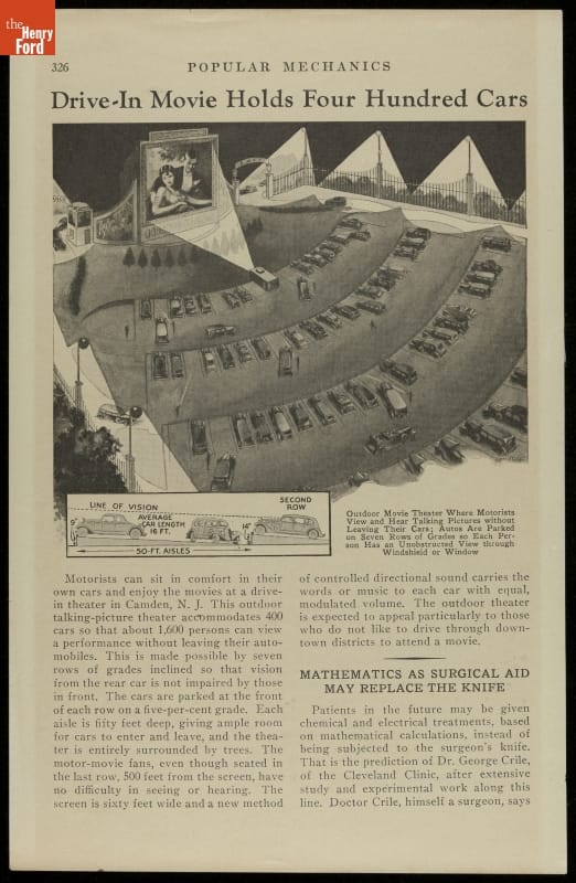Magazine Article, "Drive-In Movie Holds Four Hundred Cars," from September 1933 Popular Mechanics