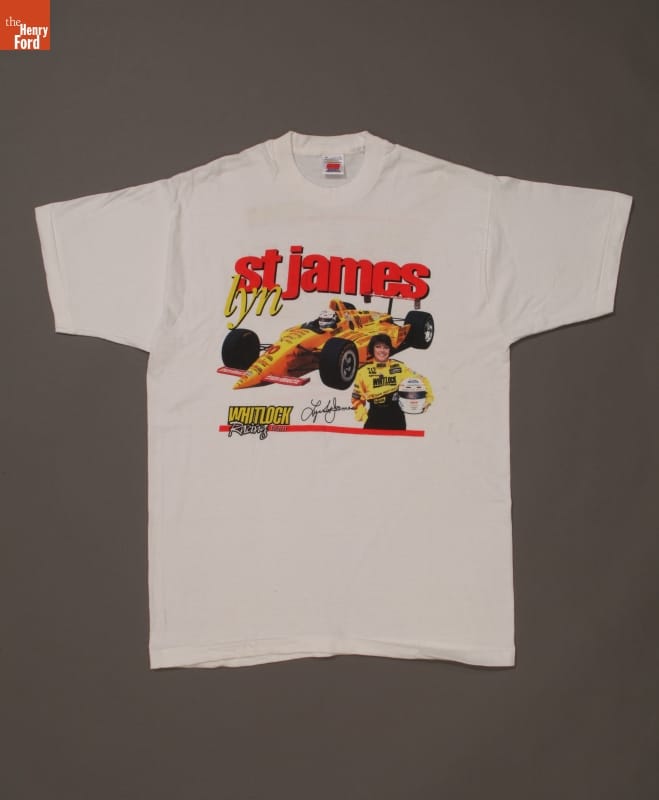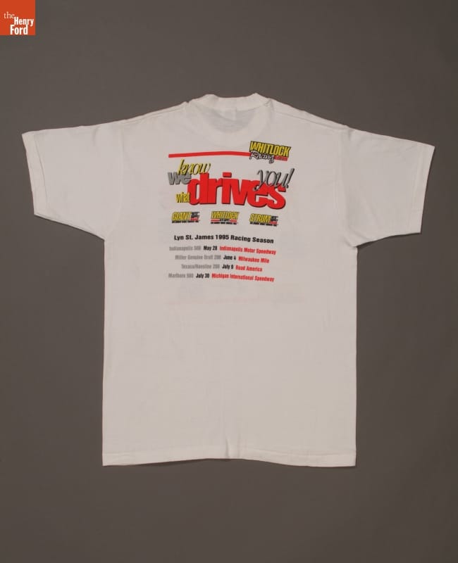 Lyn St. James's drive and determination led to a successful racing career. St. James has competed in top professional races worldwide since the mid-1970s. She established the Complete Driver Academy in 1994, where she continues to inspire and train future female race car drivers. This T-shirt promoted St. James and the 1995 Whitlock racing team.