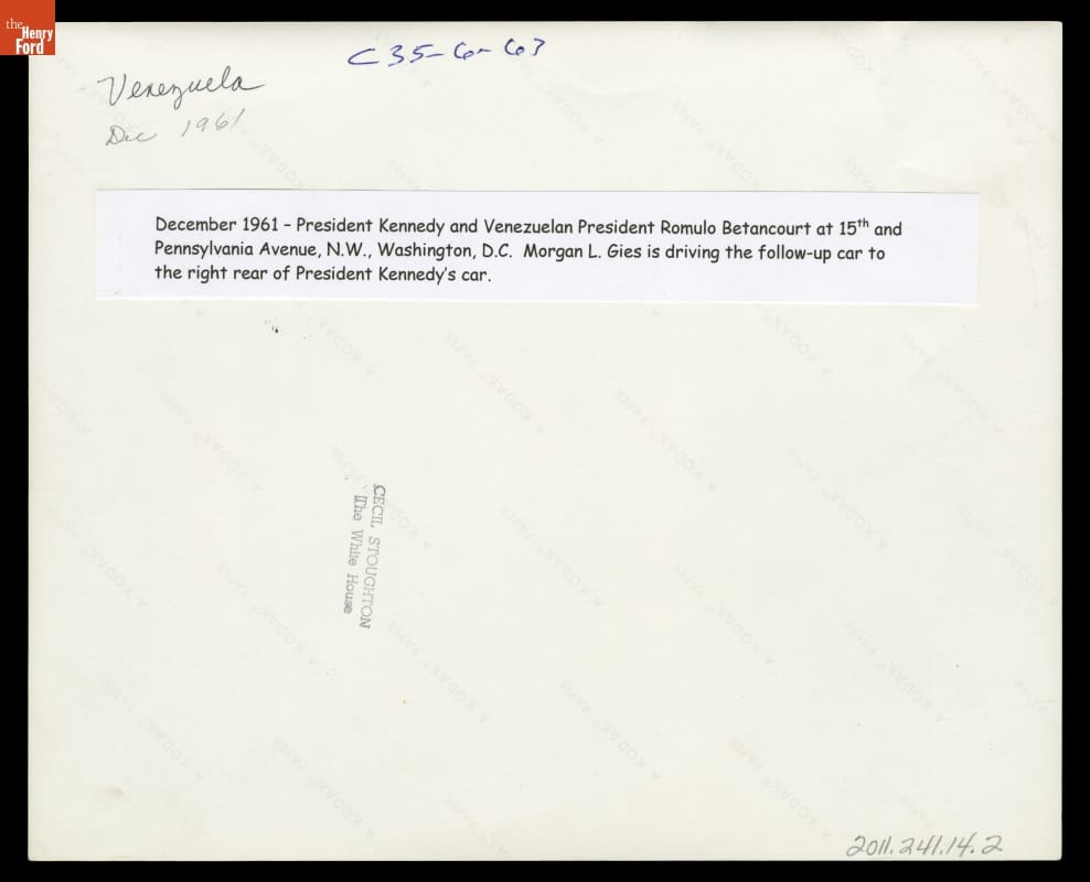 In February 1963, President John F. Kennedy and Venezuelan President Romulo Betancourt waved to onlookers lining the streets of Washington, D.C. The two ride in the 1961 Lincoln Continental Presidential Limousine. The vehicle would be radically changed after President Kennedy's assassination. A permanent roof, bullet-proof glass, and extensive armor-plating made the car much more secure.